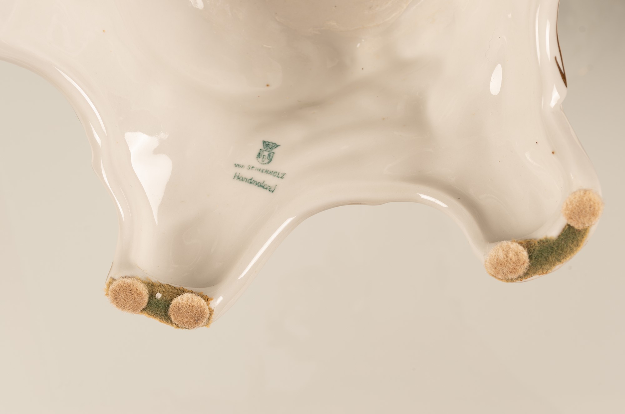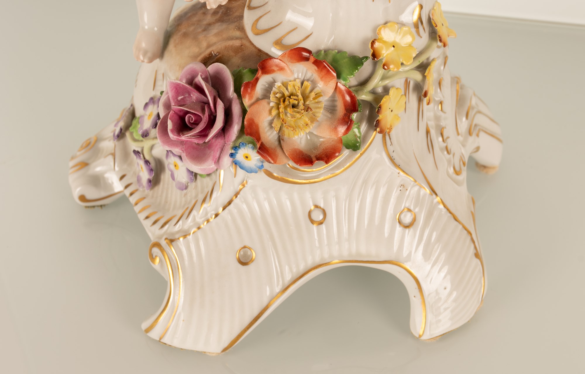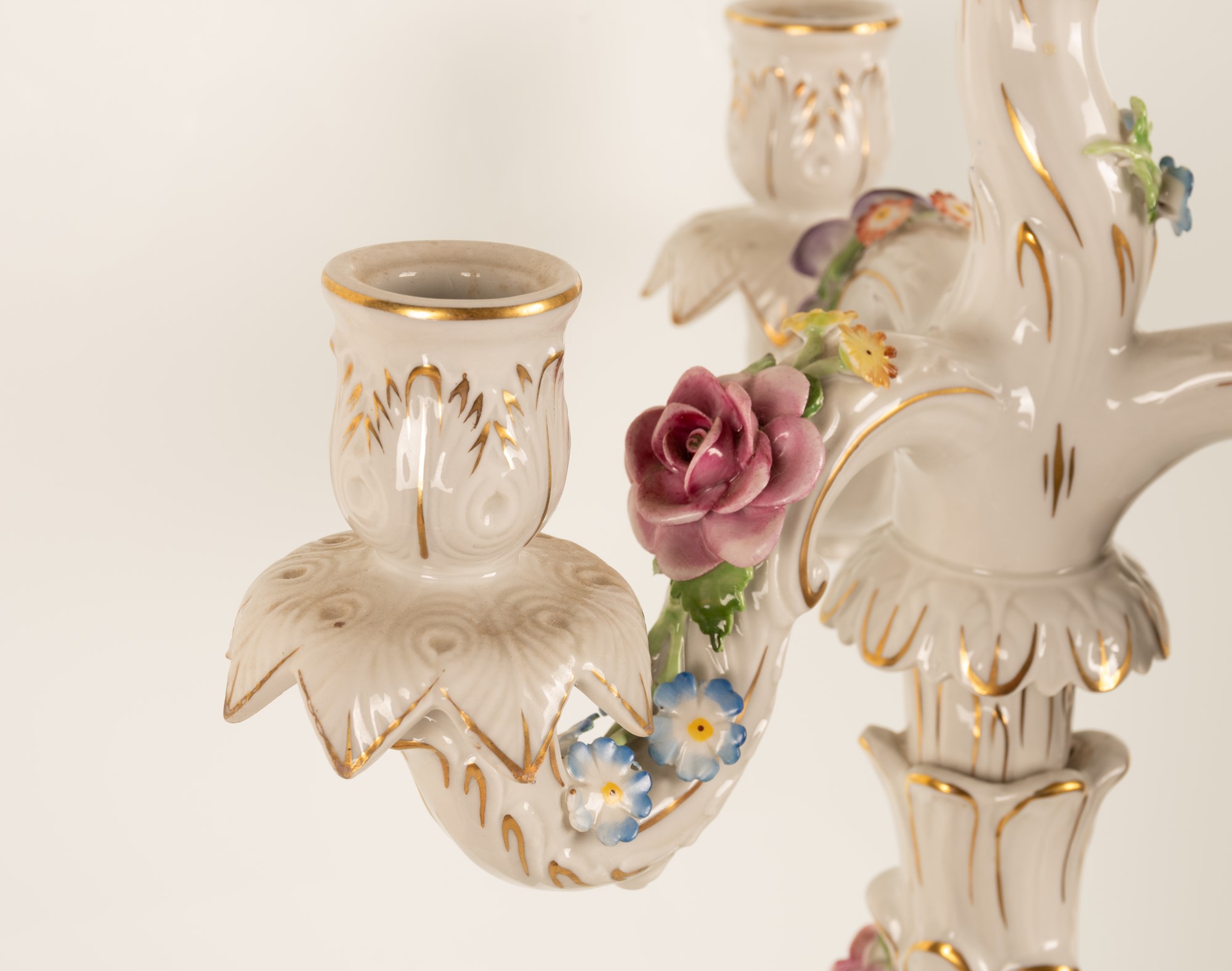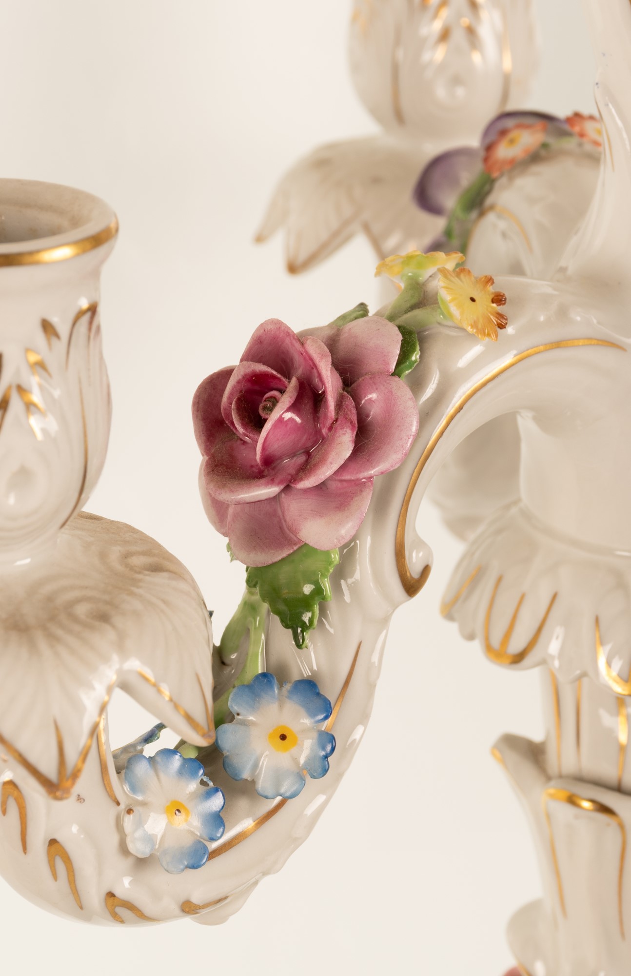 Coppia di grandi candelieri in porcellana con decoro plastico formato da putti e ghirlande di fiori a rilievo disposti sulla base e sugli elementi decorativi dei bracci (in stile rococò) Manifattura Sitzendorf, inizi del XX secolo.