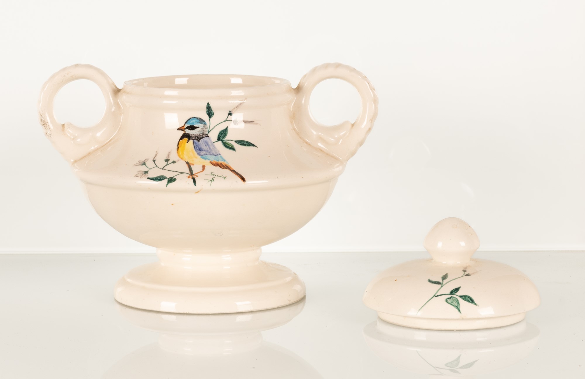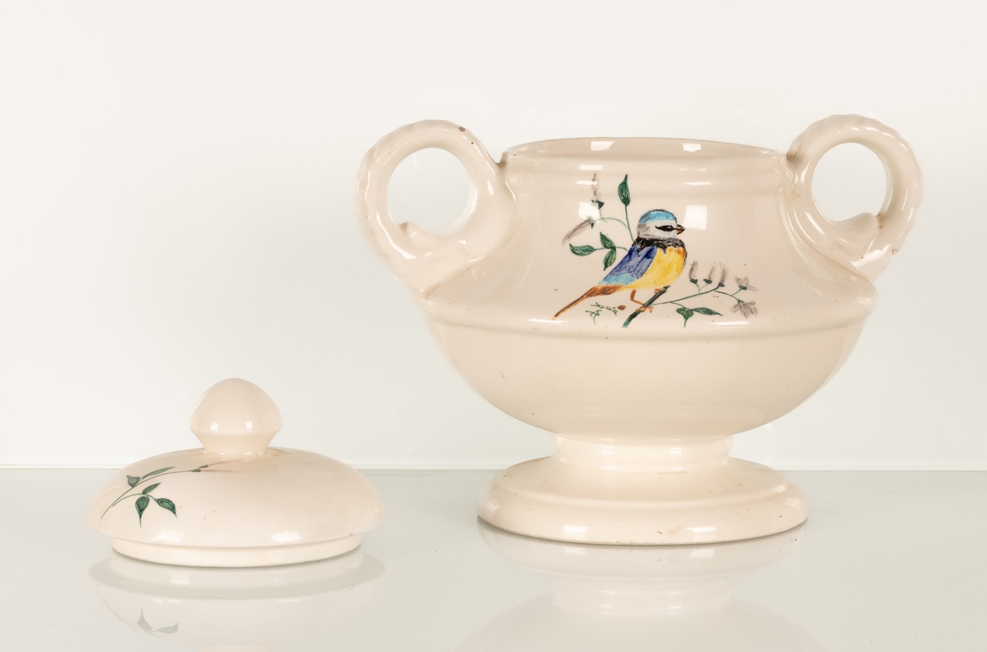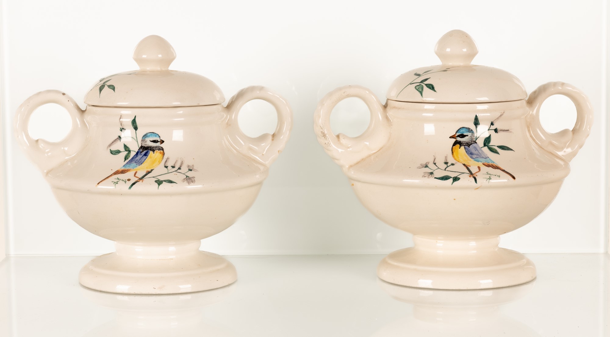 Coppia di vasi biansati con decoro a uccello.