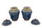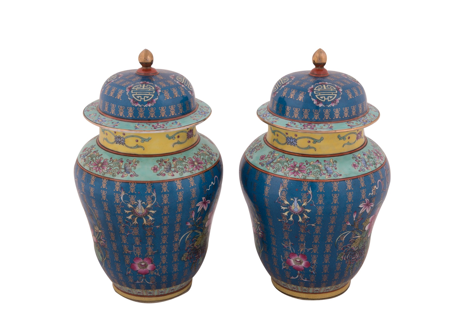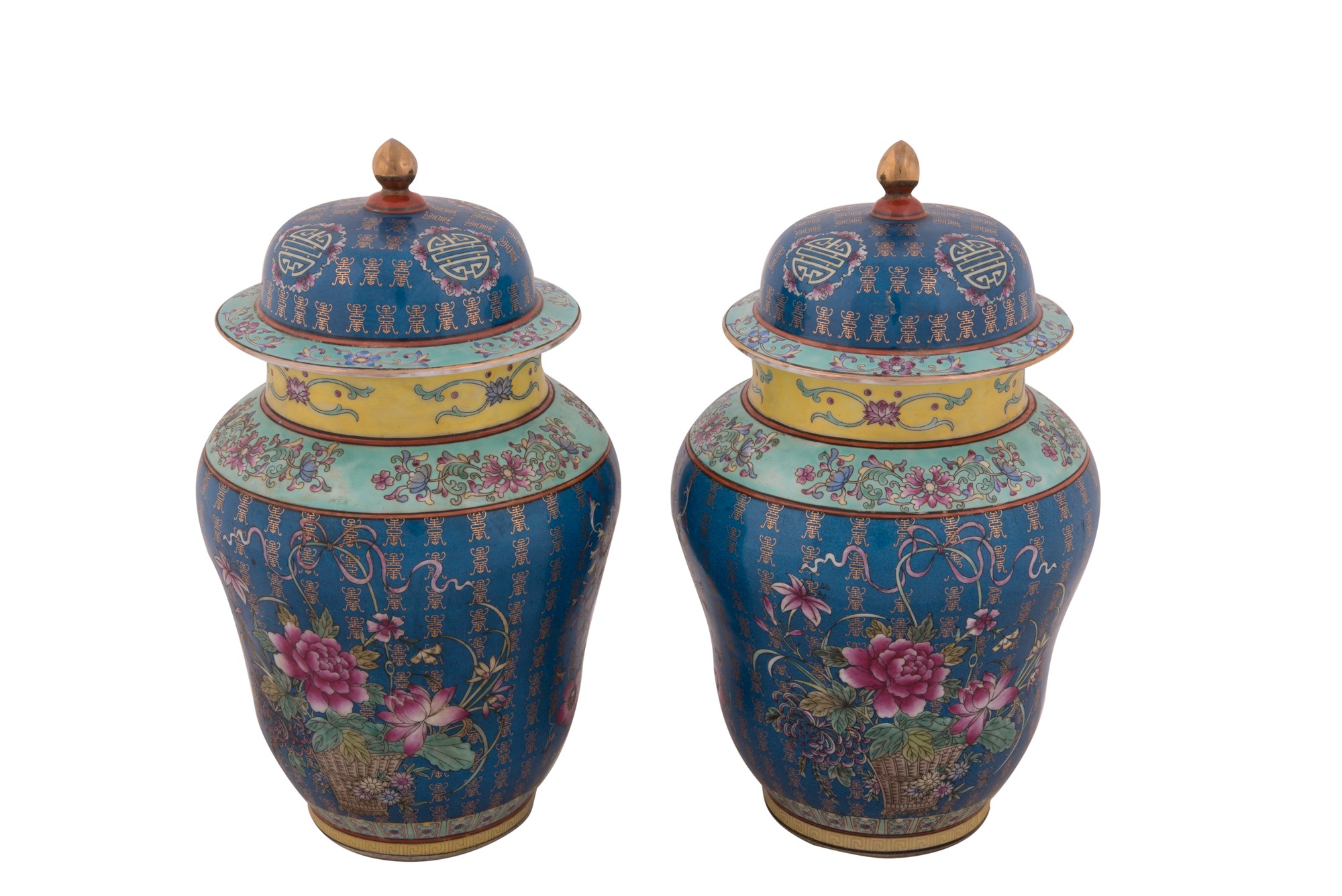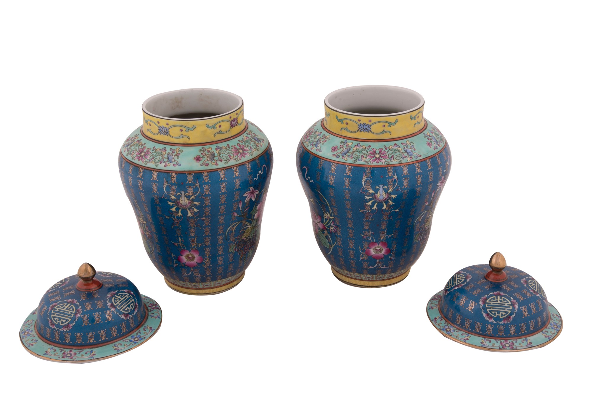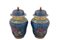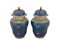 Coppia di vasi in porcellana decorata nei toni del blu, celeste e giallo con particolari motivi che corrono lungo il corpo e il coperchio.