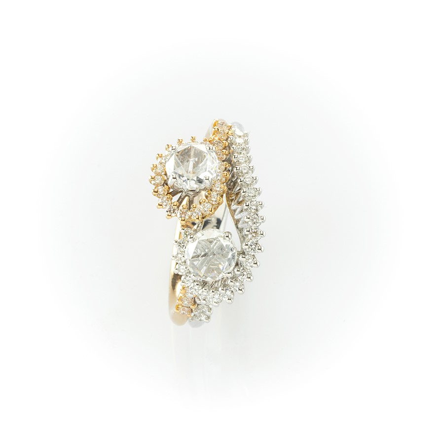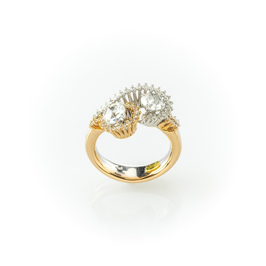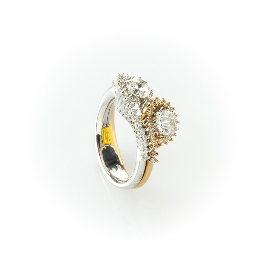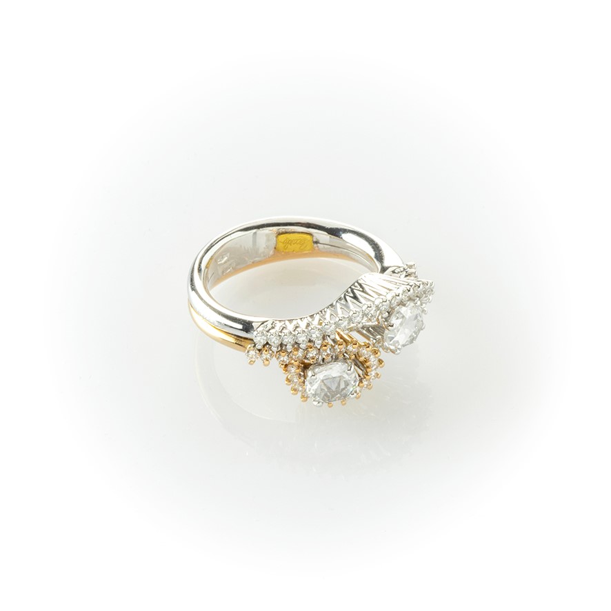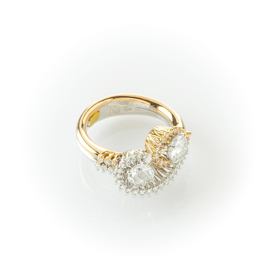 Anello contrariè realizzato in oro giallo e bianco con due diamanti centrali e pavè di diamanti