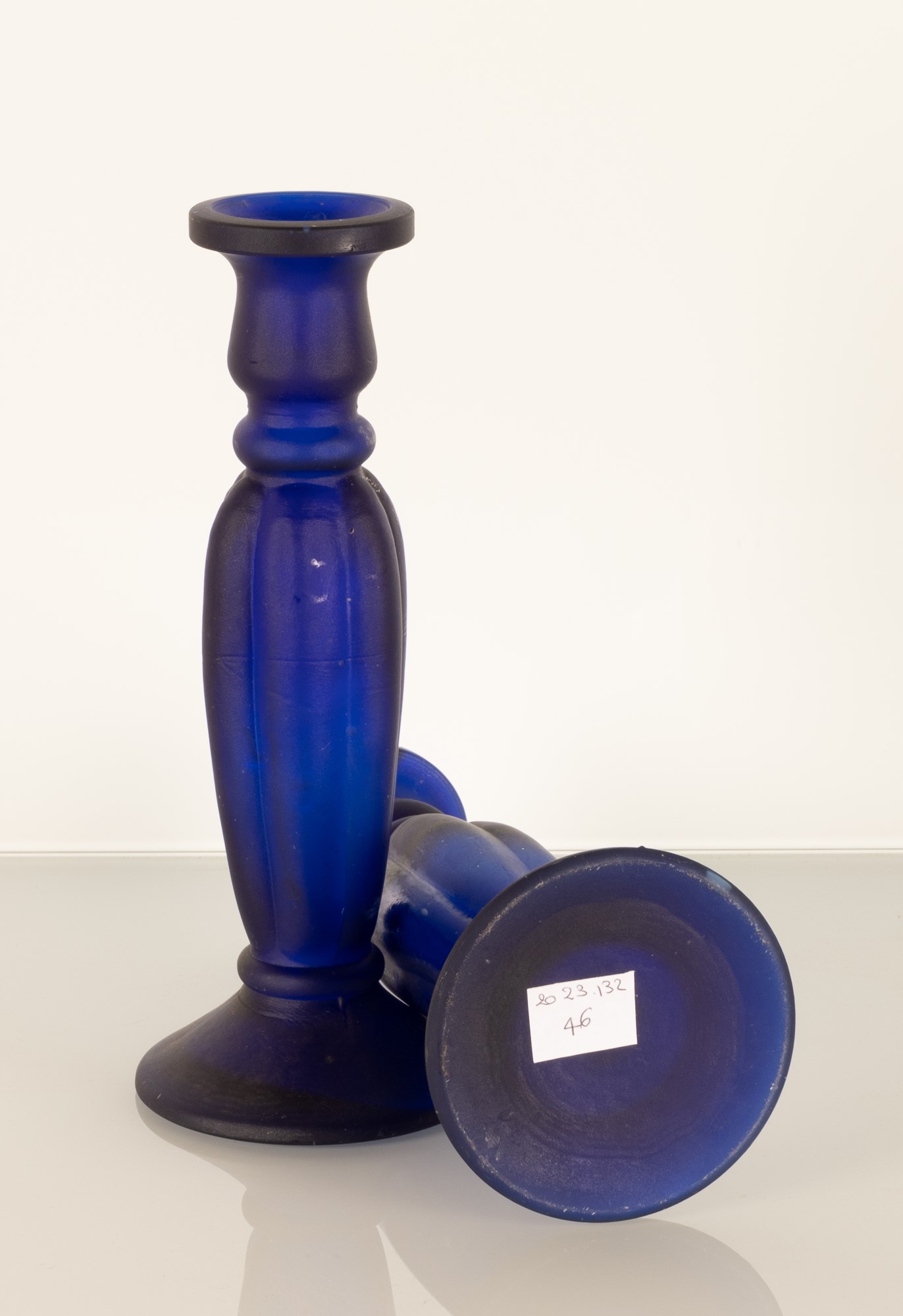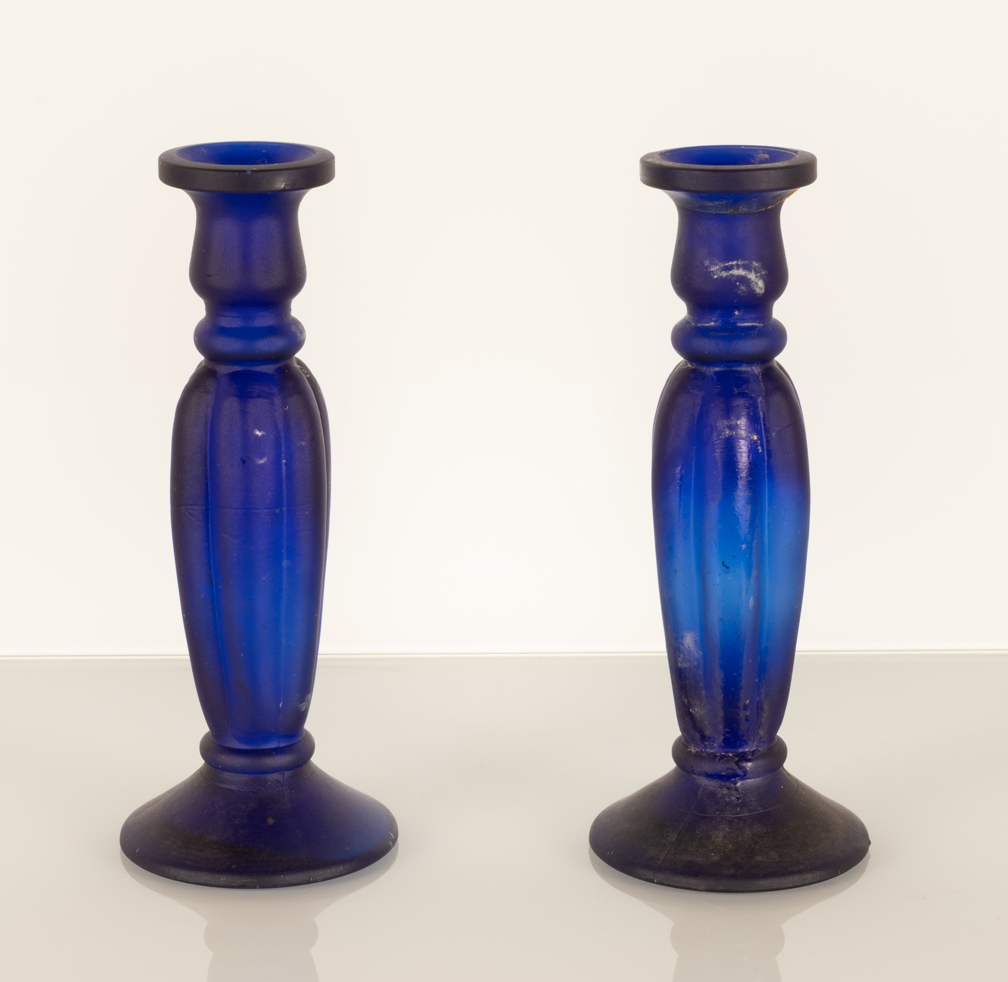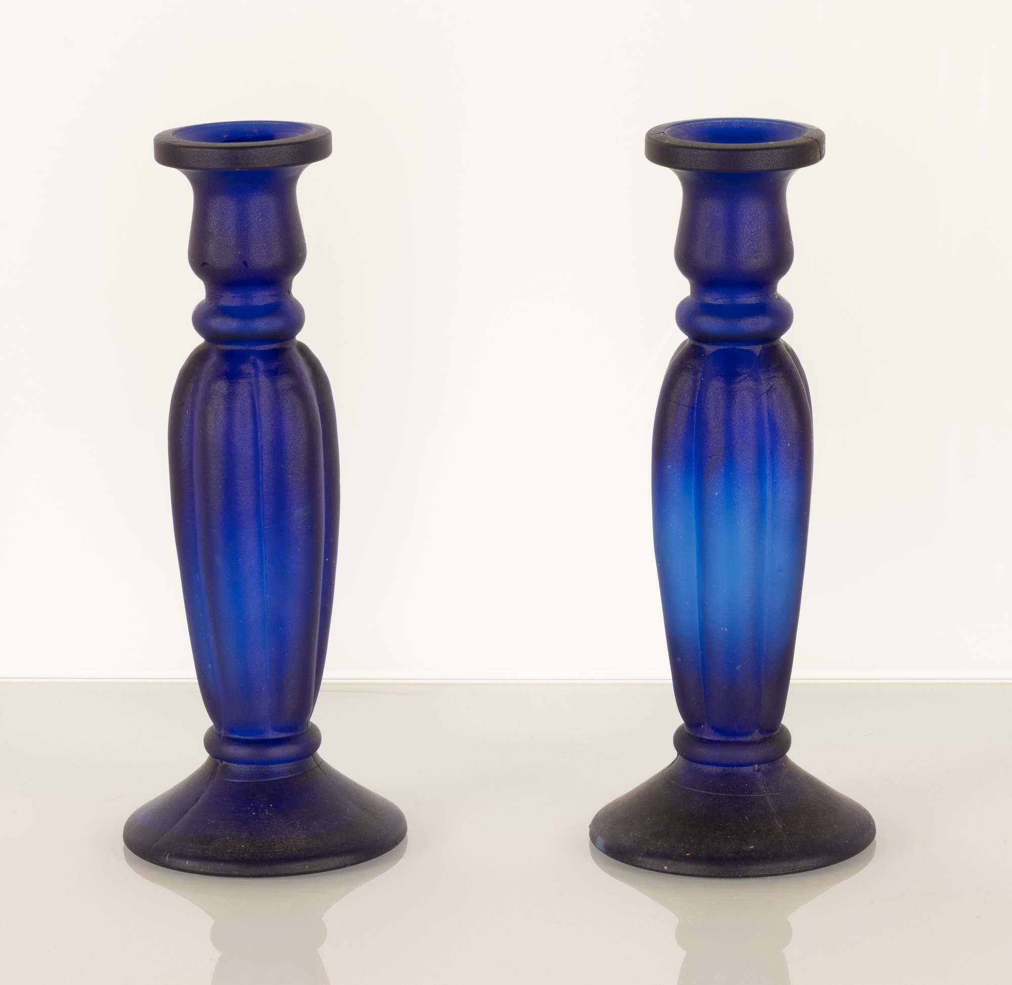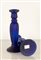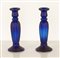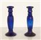 Coppia di portacandele in vetro opalino blu. Fusto costolato. Manifattura italiana, XX secolo