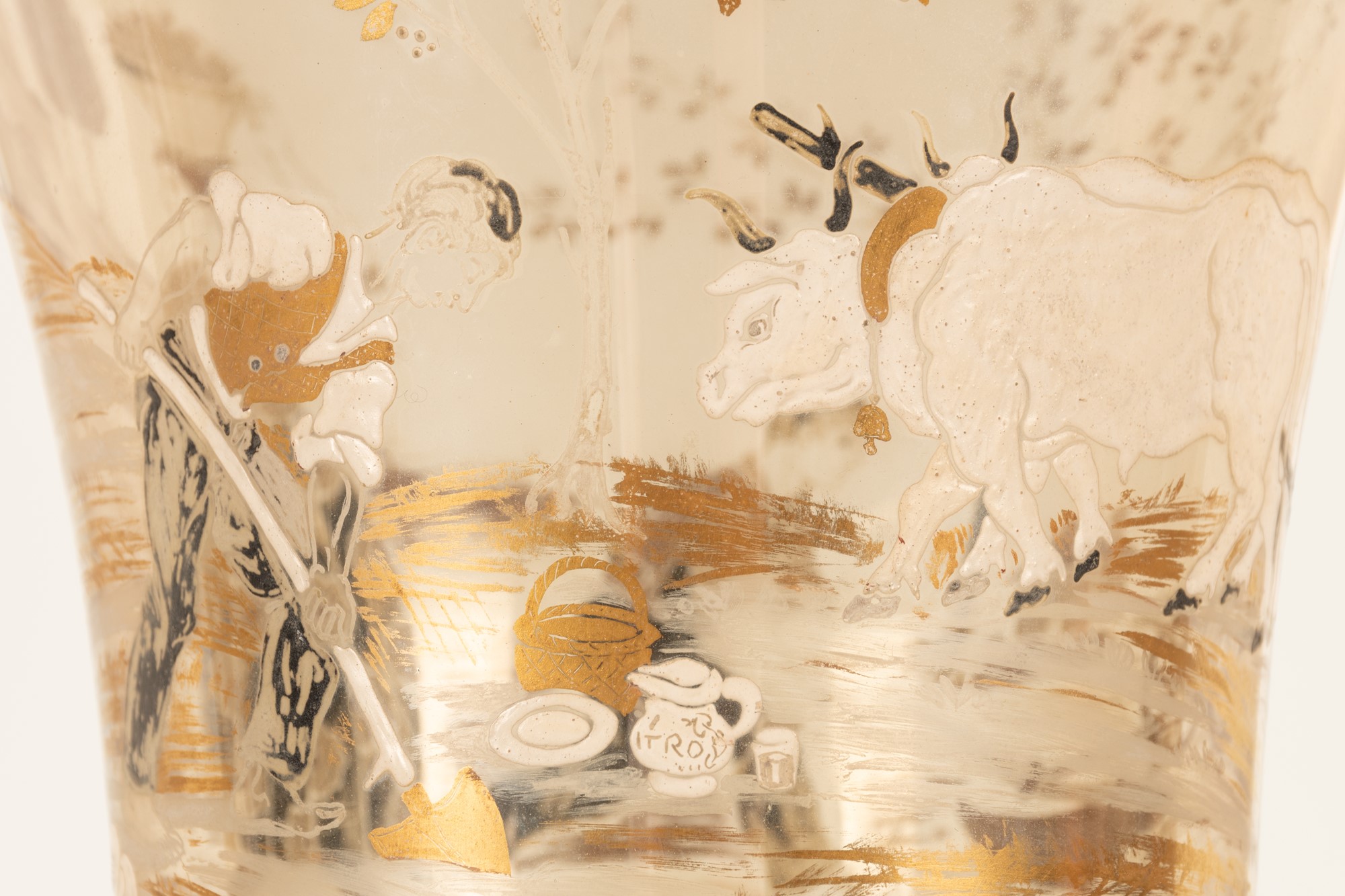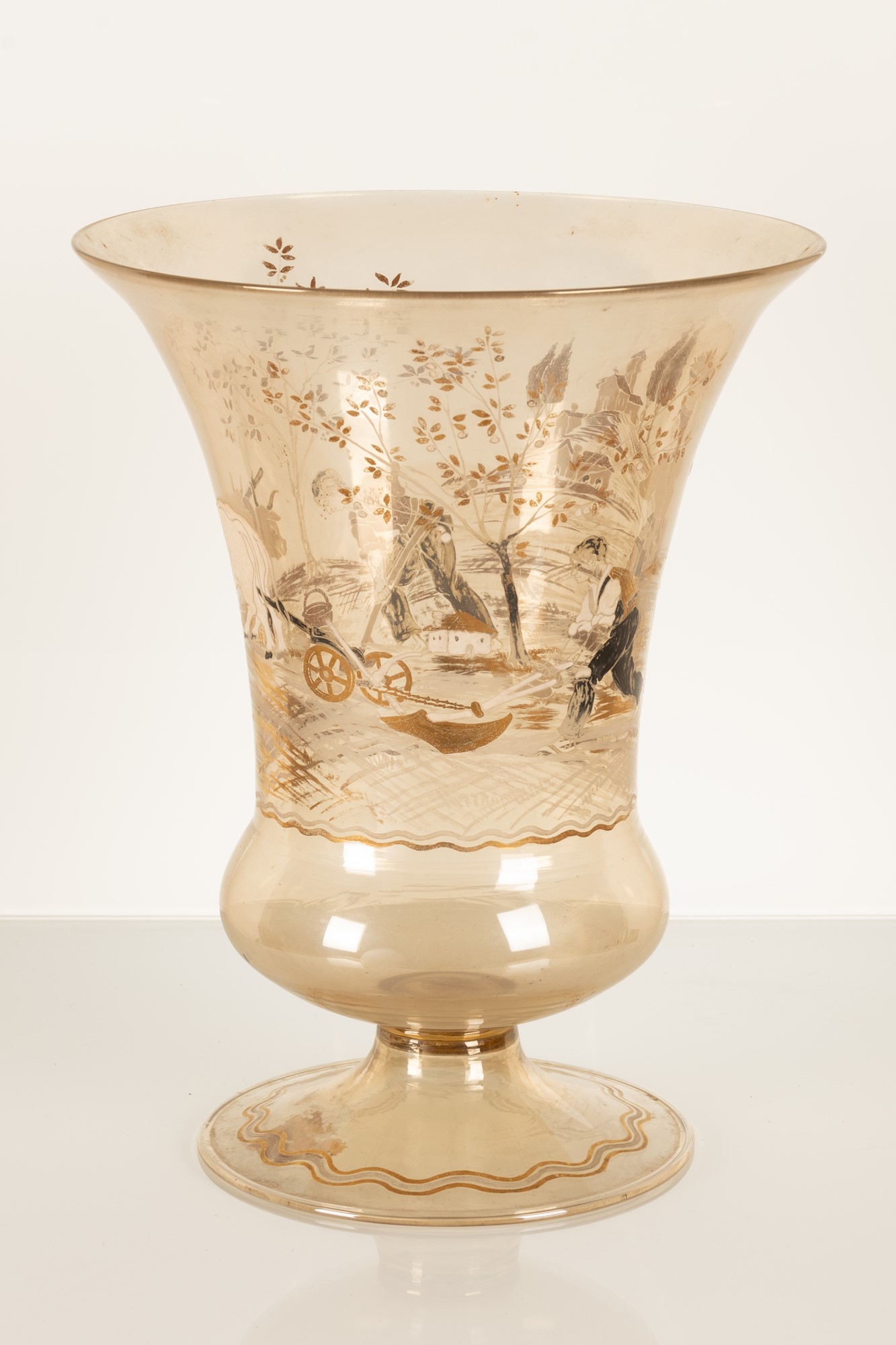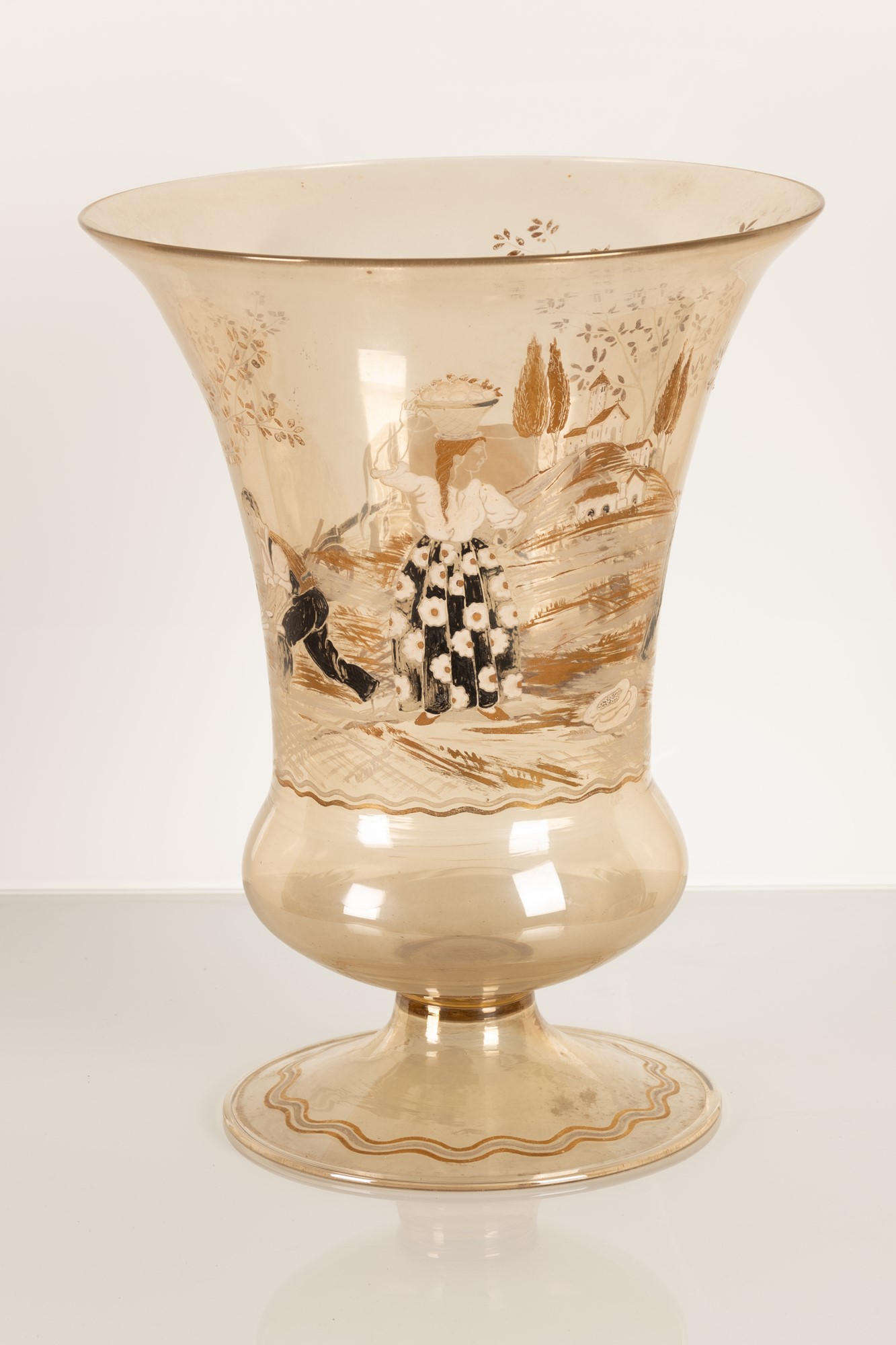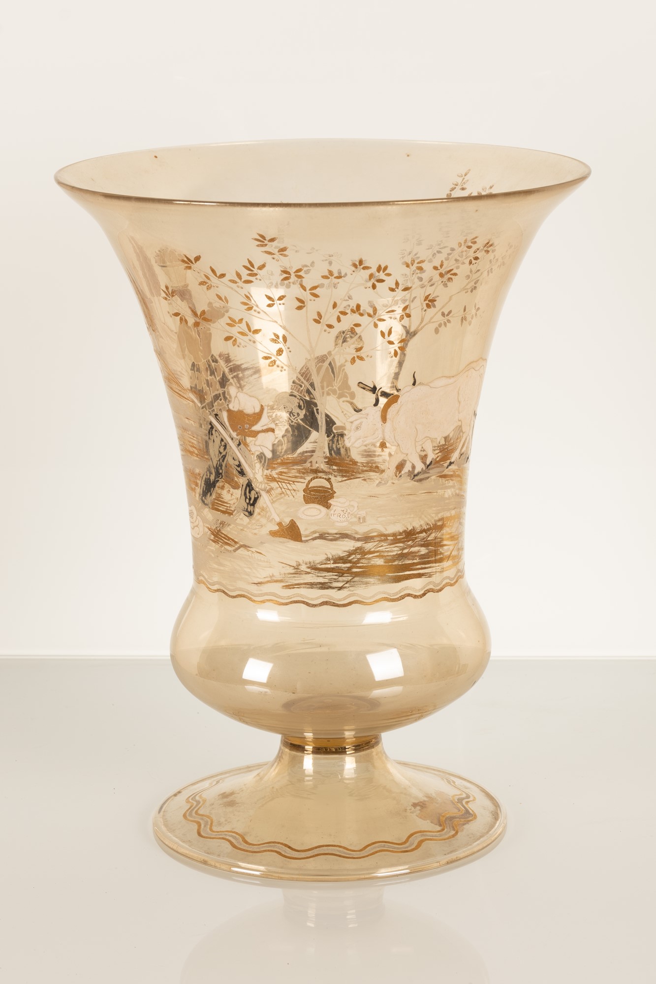 Grande anfora in vetro con scene bucoliche in oro e manganese