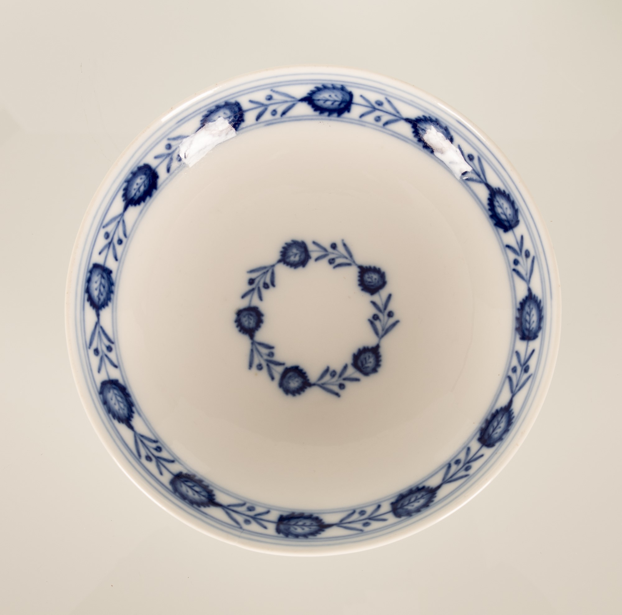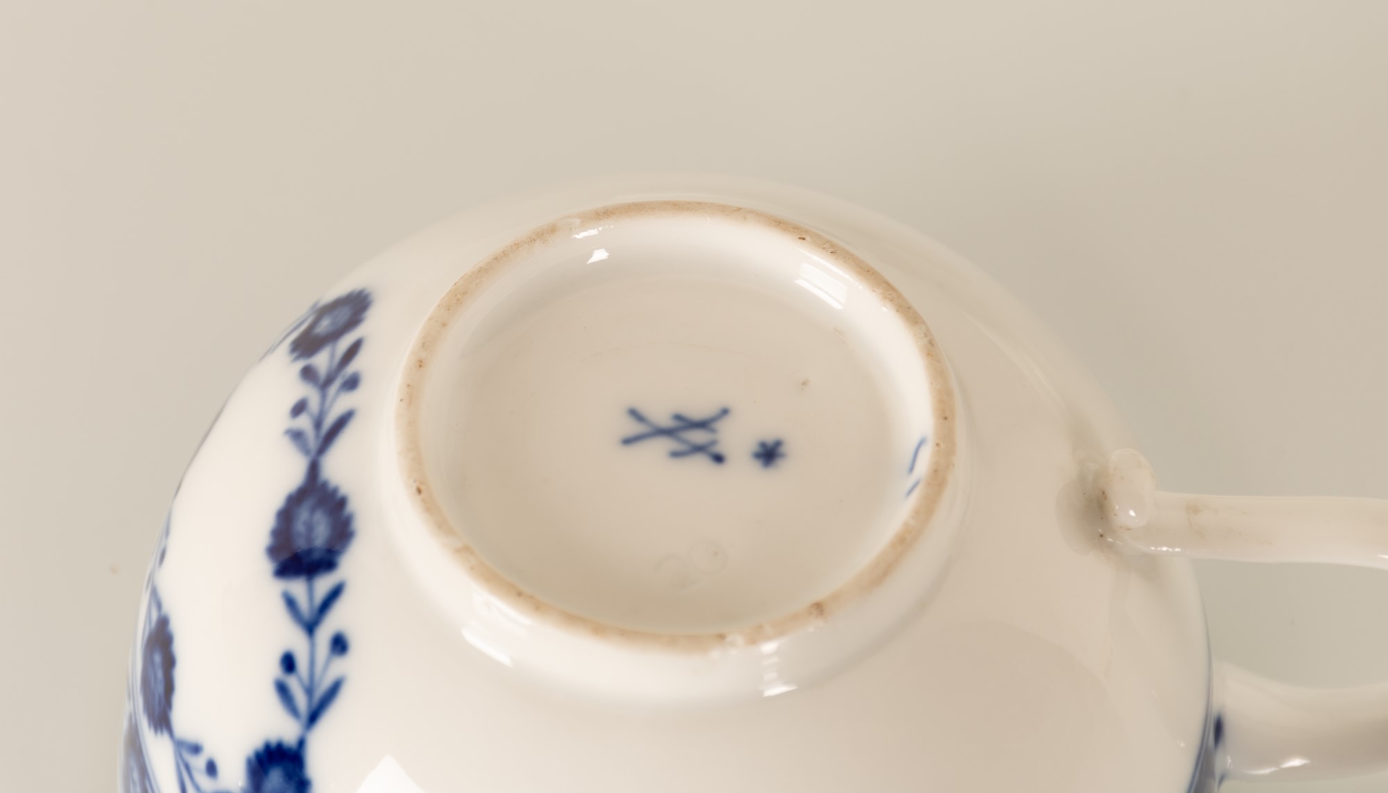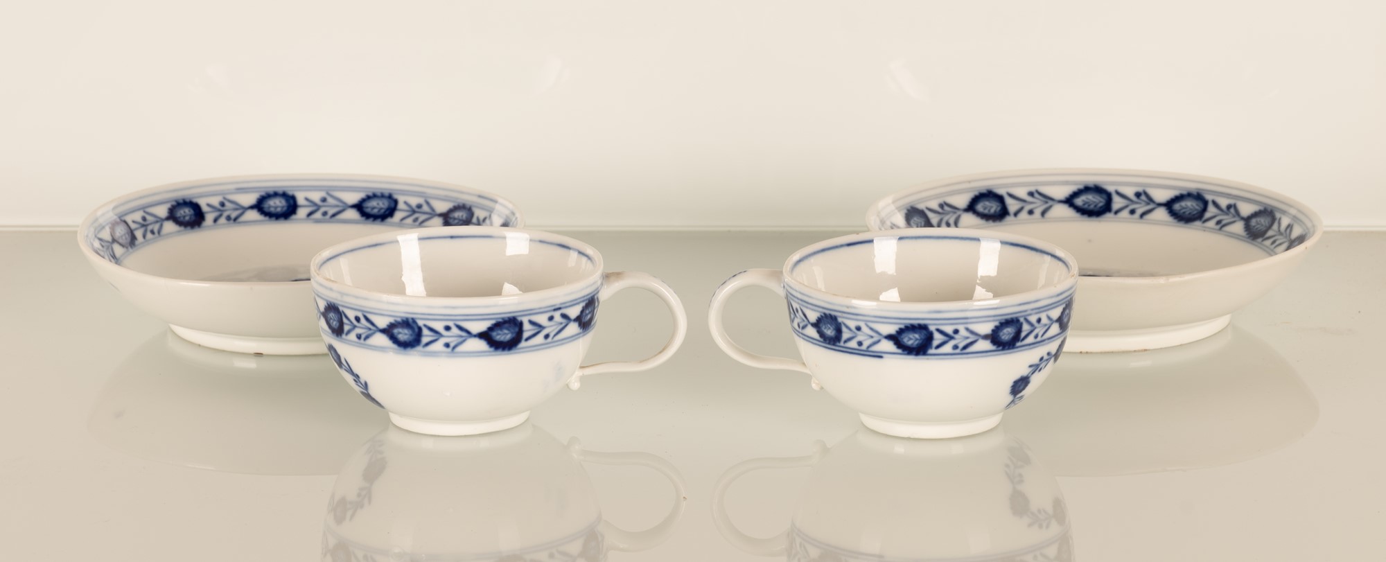 I piattini sono dipinti nel cavetto con egual decoro, mentre un singolo fiore blu con stelo è nella parte interna delle due tazzine.