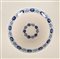 Decoro alterato floreale e fogliato su fondo blu, sia sul bordo delle tazzine che nella tesa dei piatti.