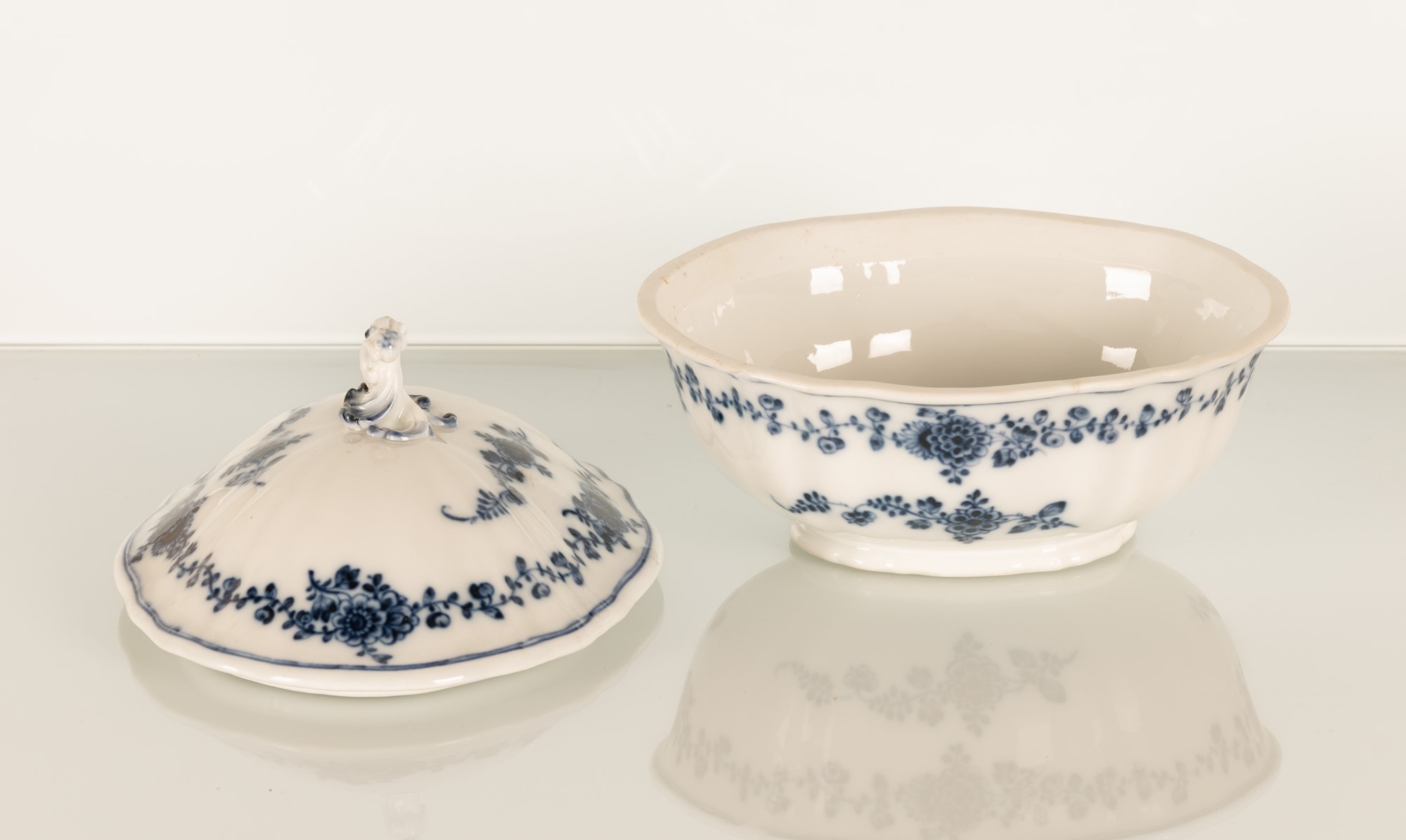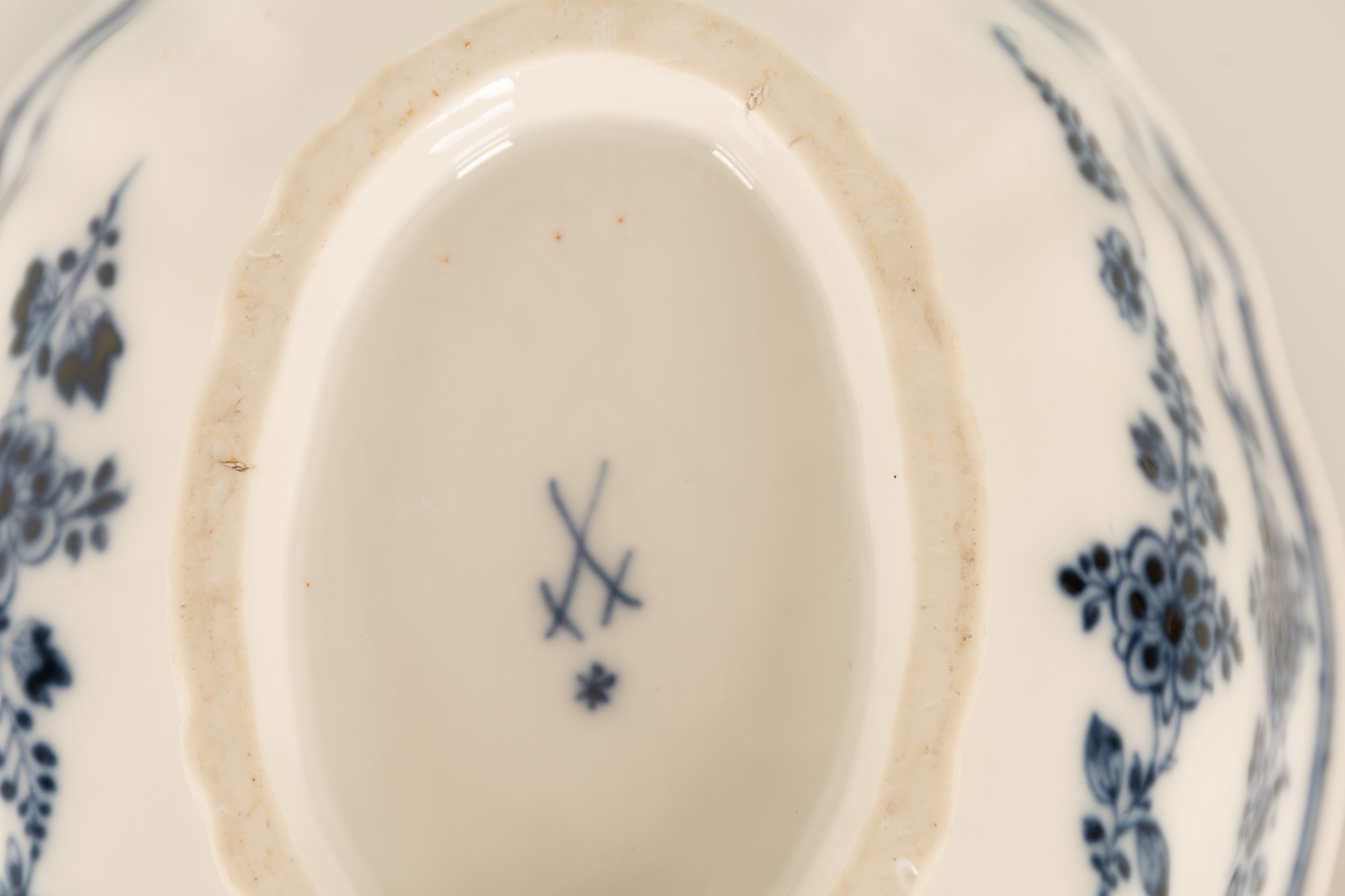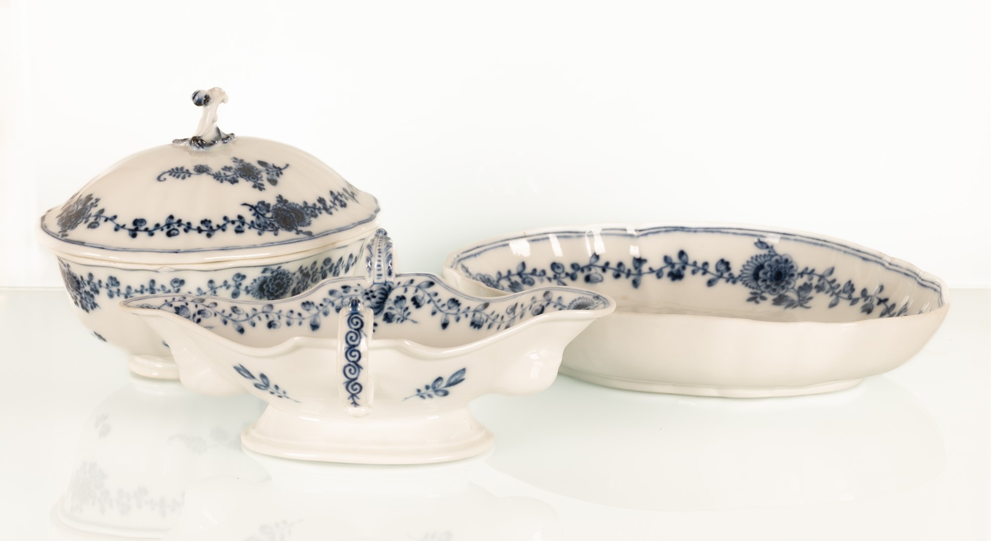 Tre elementi in porcellana, piccola zuppiera, salsiera e vassoio. Manifattura Meissen, XVIII secolo