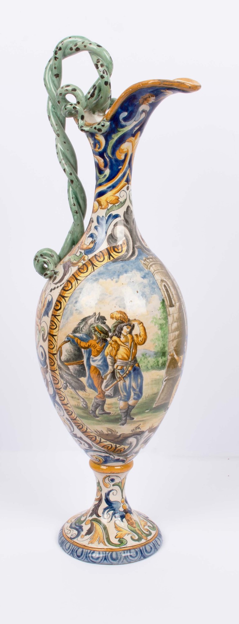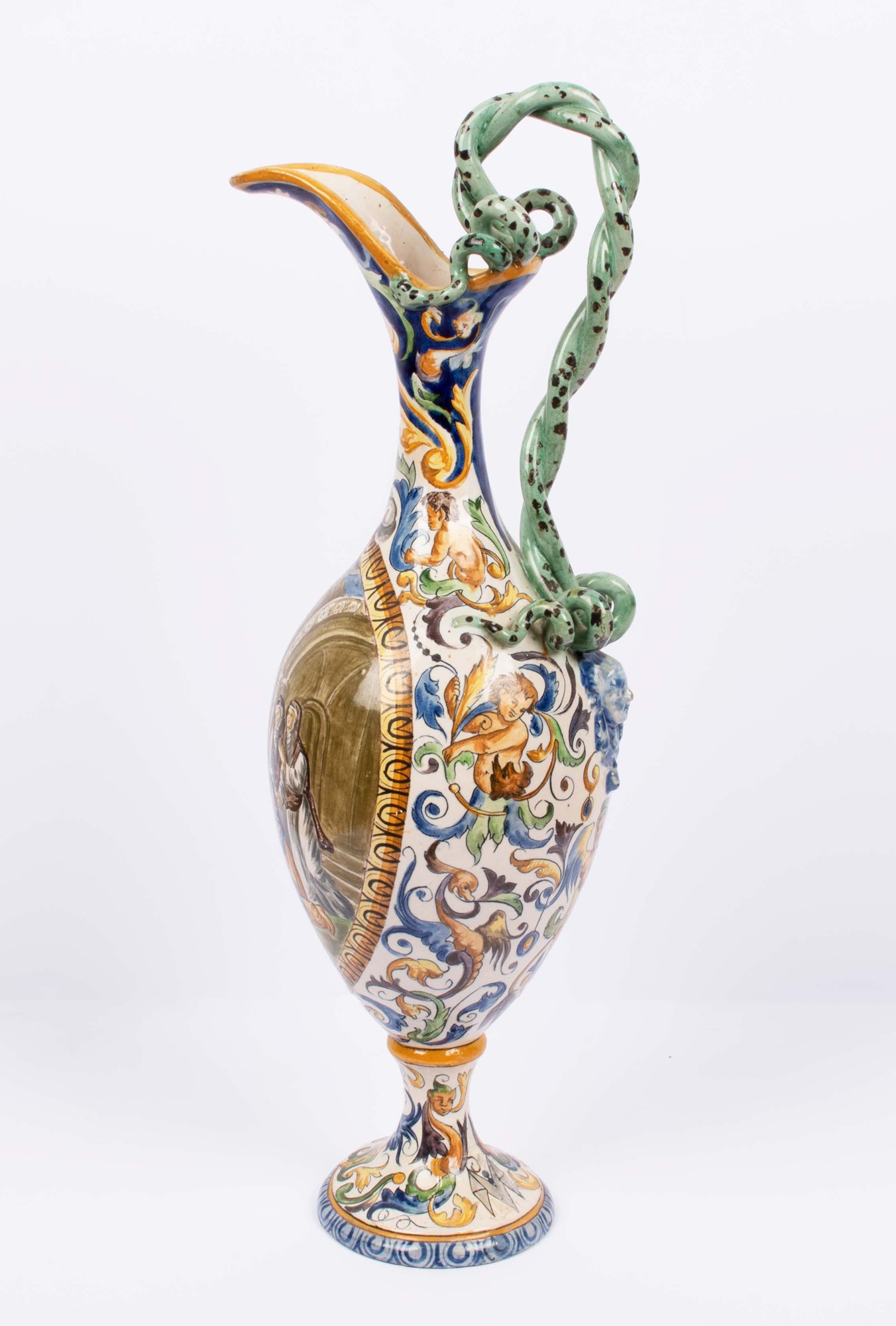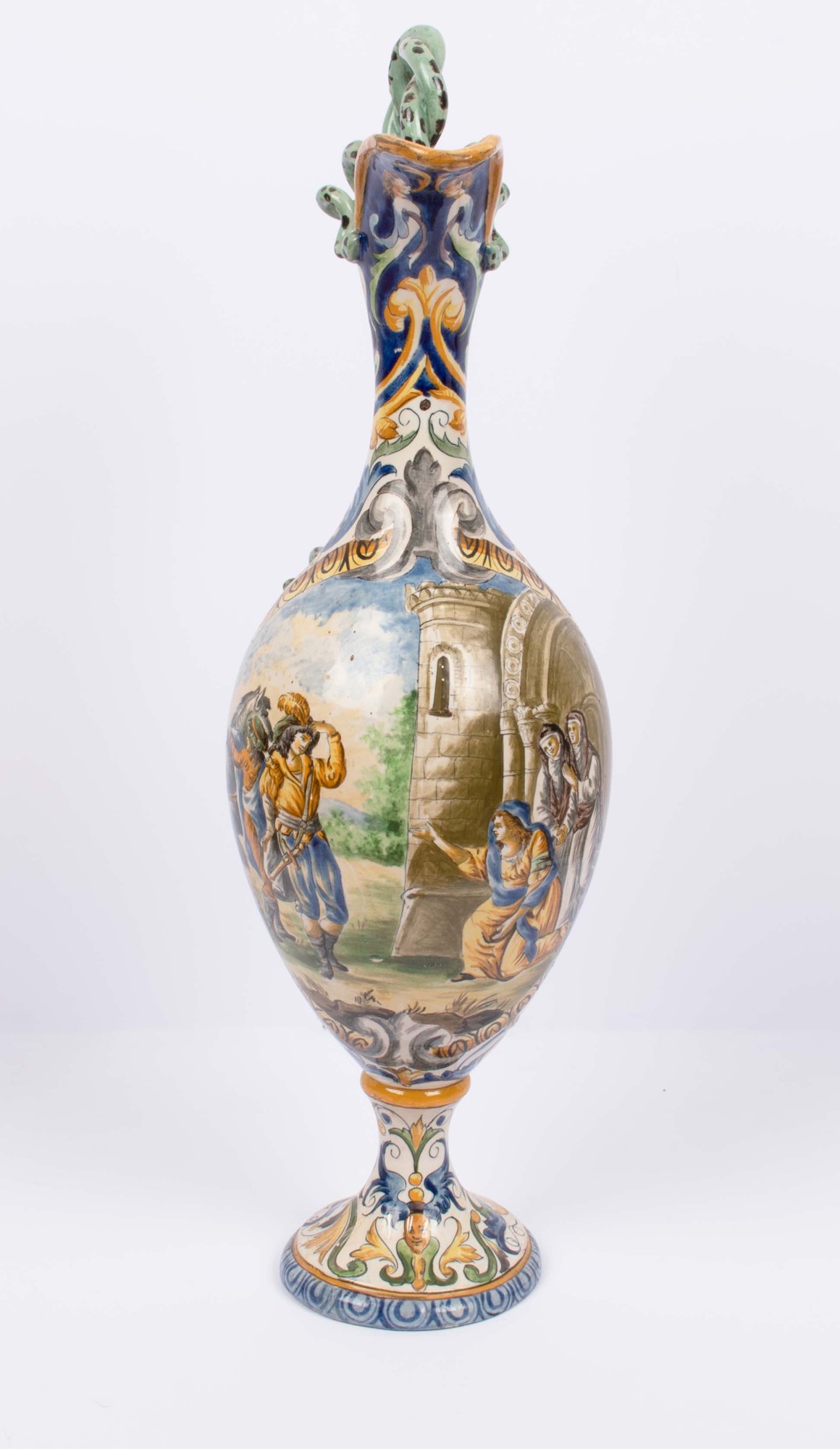Grande anfora in maiolica con ansa serpentiforme e con decoro a grottesche di gusto rinascimentale. Manifattura Napoli Gaetano Battaglia, XIX secolo