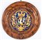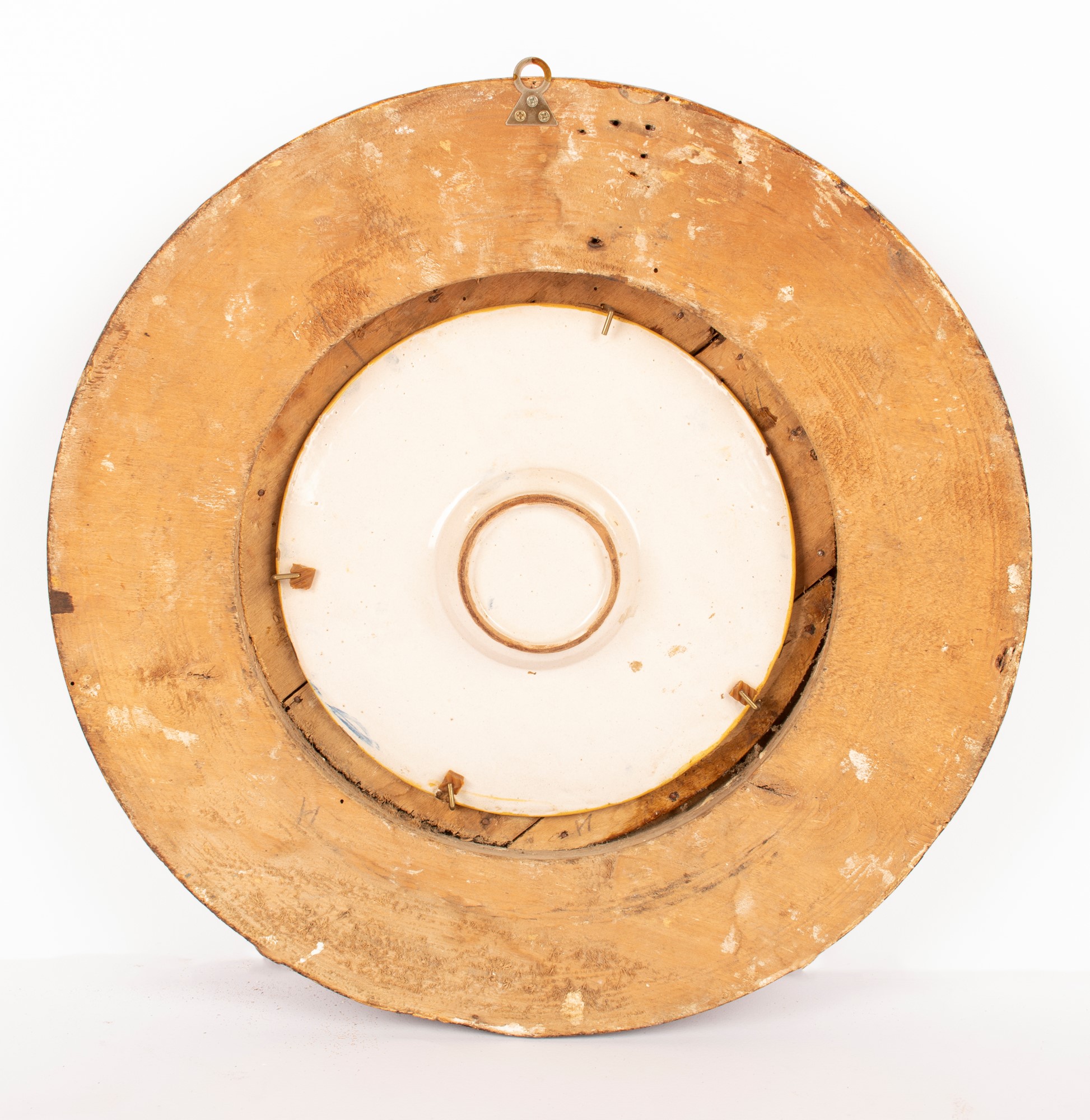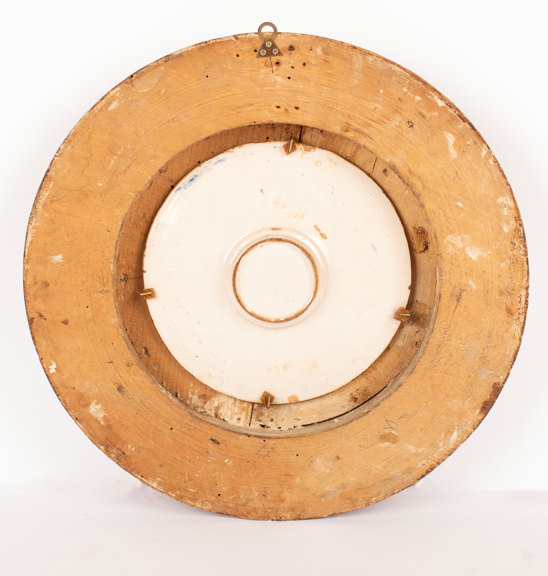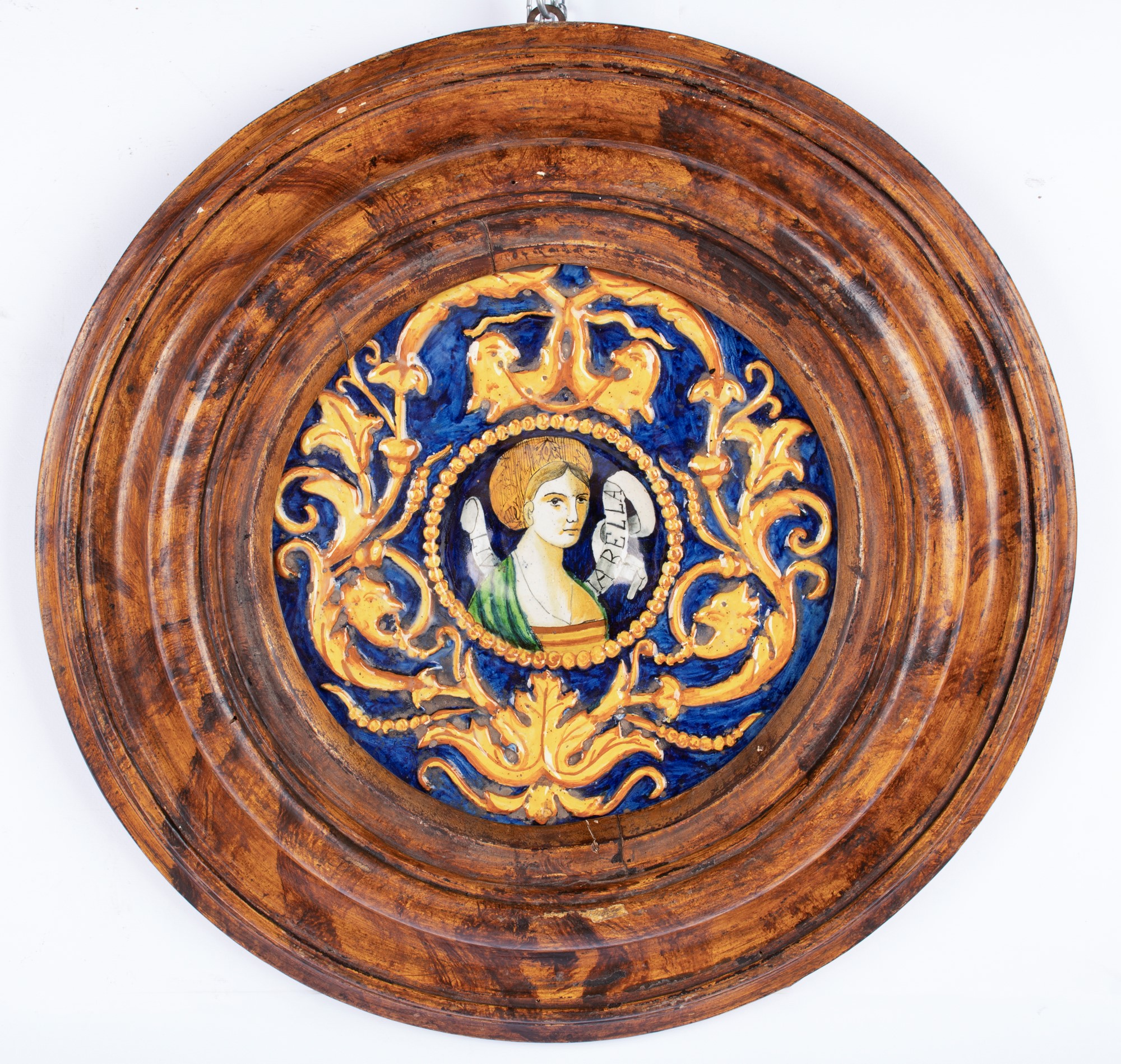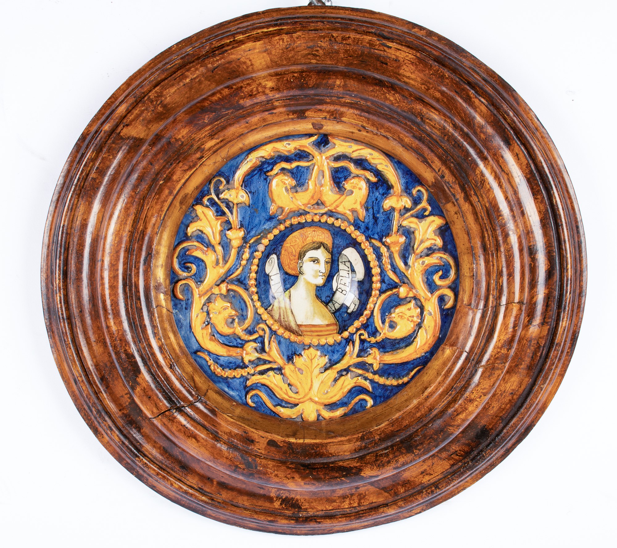 diametro cm 25; con cornice diametro cm 43 Nelle tese decorazioni di gusto raffaellesco a rilievo e al centro dei cavetti in una riserva perlinata l'immagine di due "belle" circondate da cartigli recanti i nomi delle stesse.