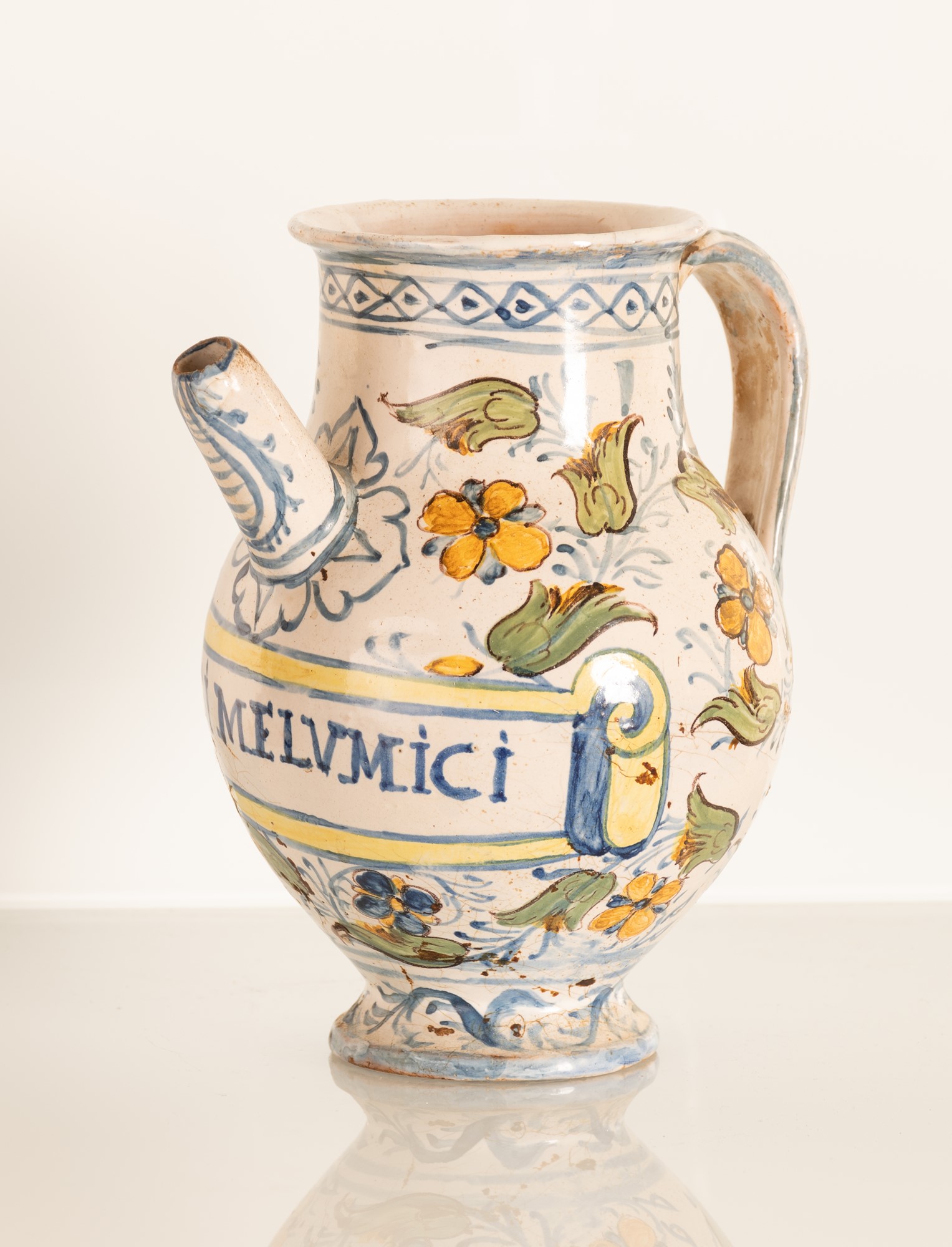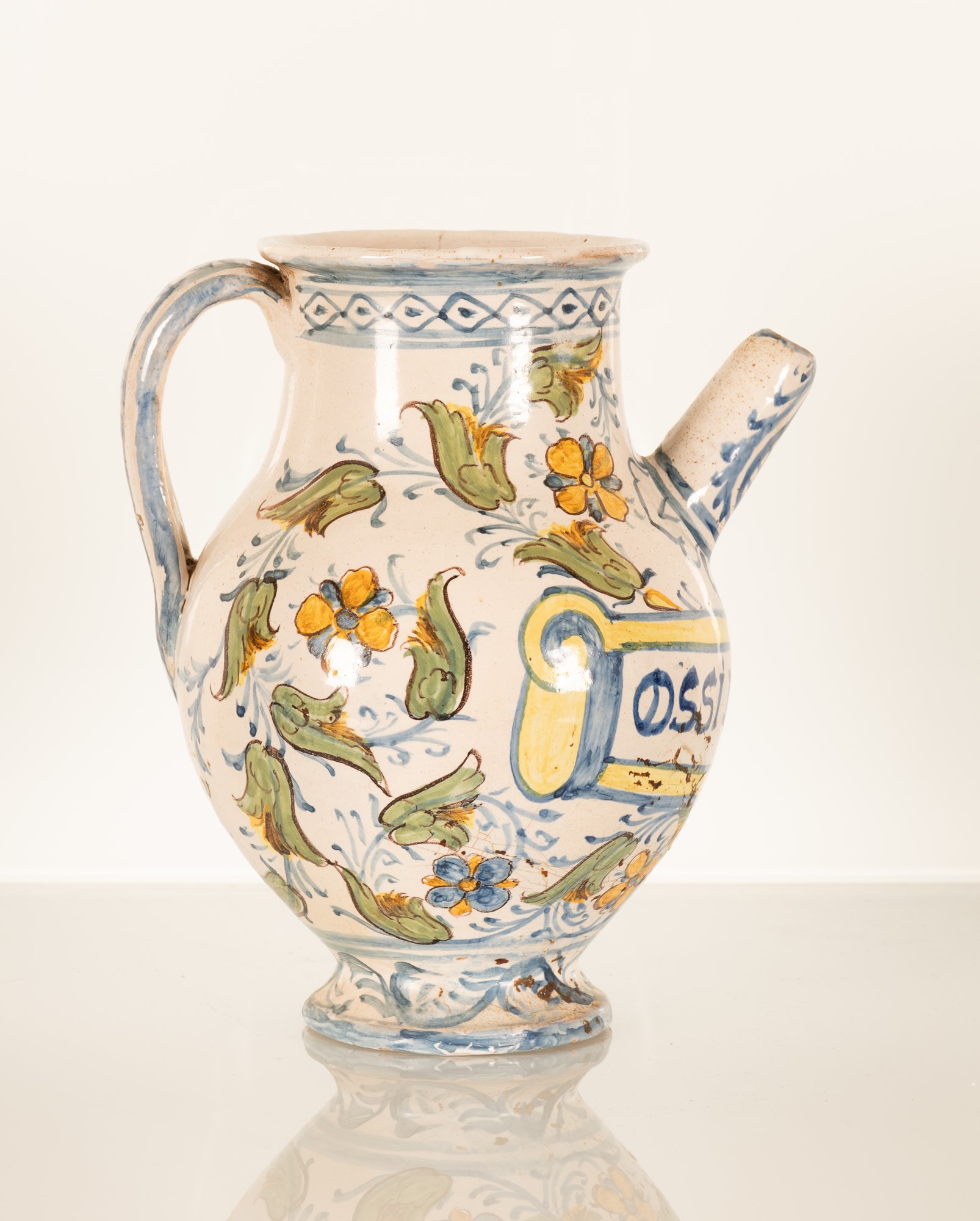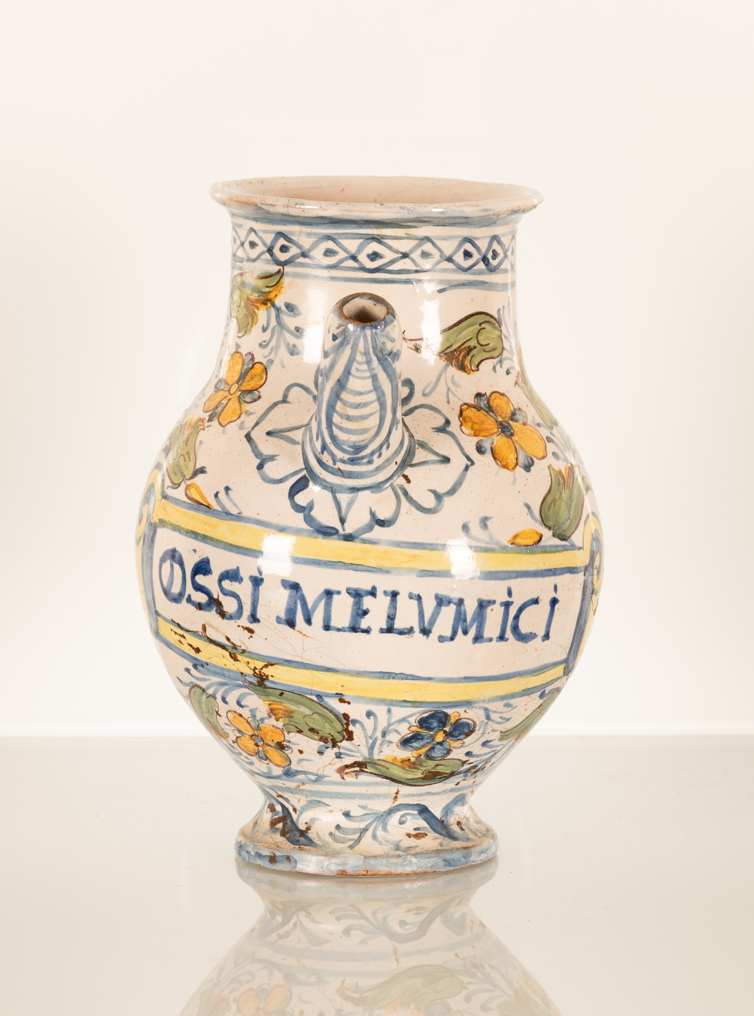 Orcio da farmacia decorato con girali fioriti e con cartiglio indicante denominazione del farmaco contenuto in lettere capitali "OSSI MELVMICI". Manifattura laziale della fine del XVII secolo e gli inizi del XVIII secolo.