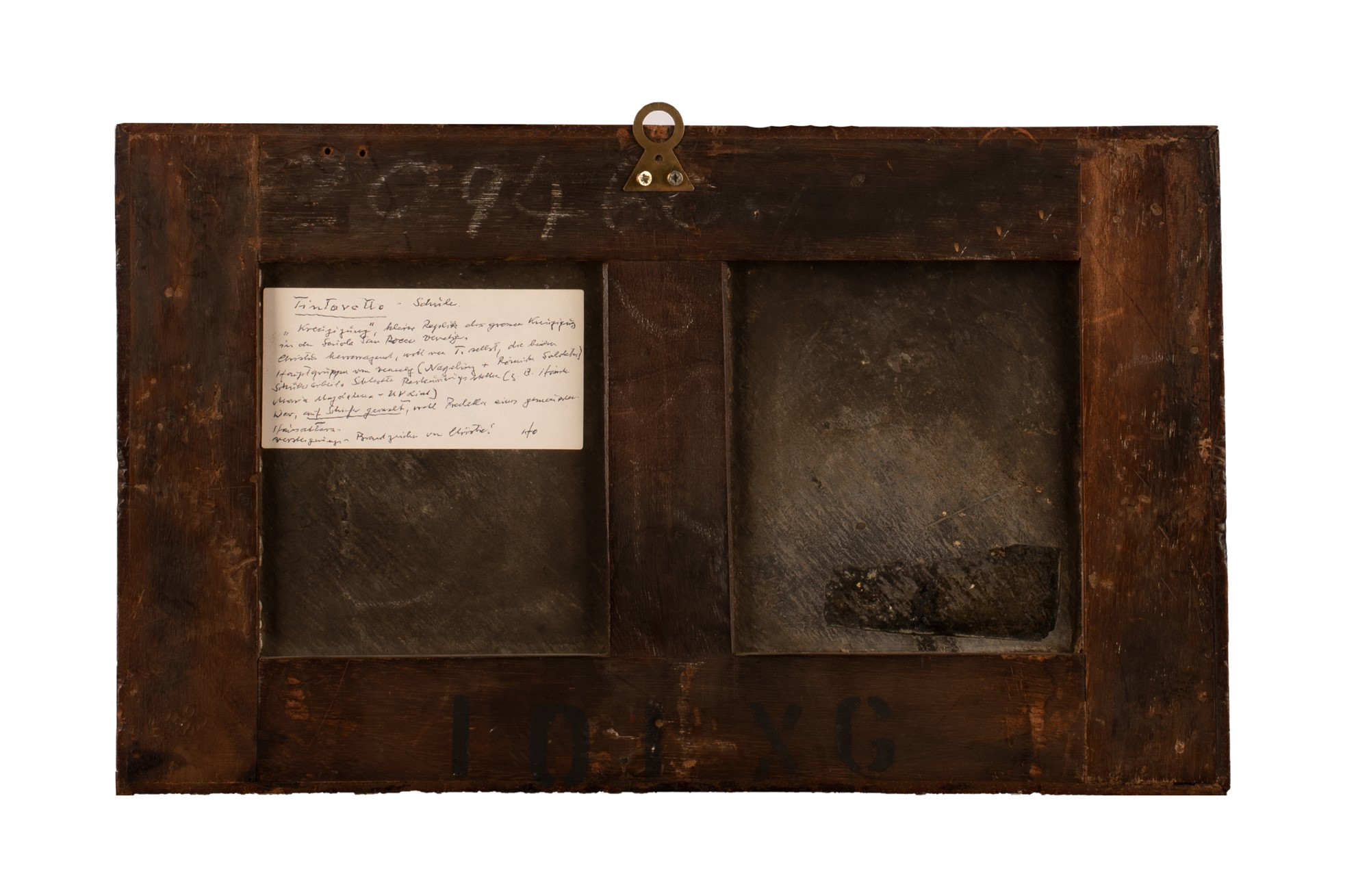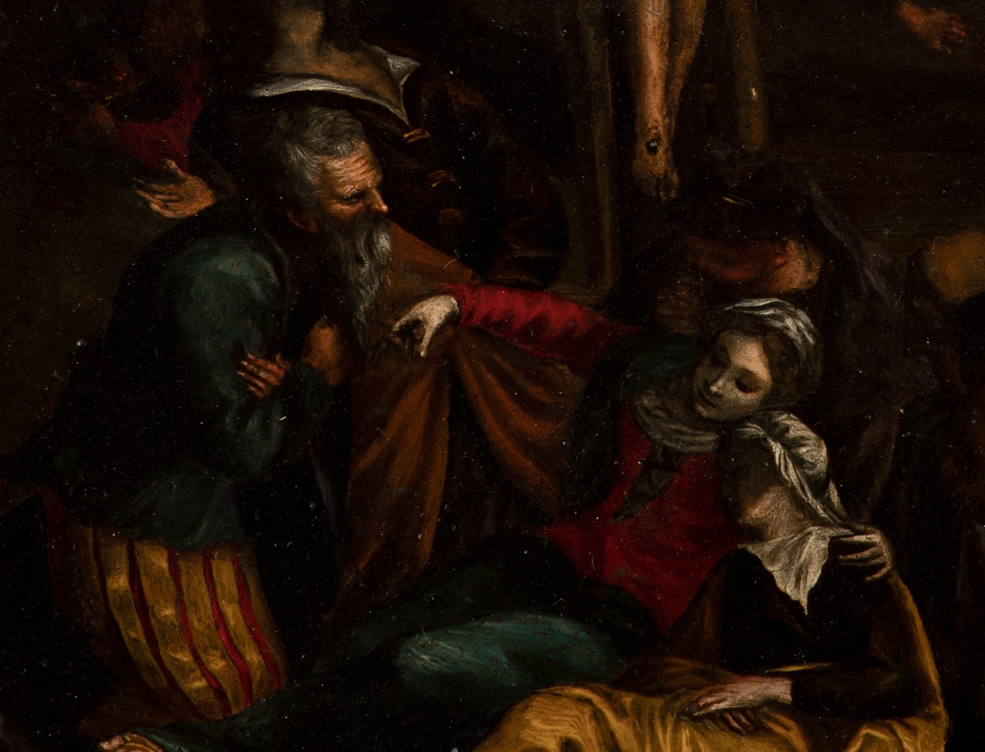 olio su ardesia cm 19x33; con cornice cm 21x34,5 Pur se di piccole dimensioni e con campo più ristretto è evidente il richiamo alla crocifissione del Tintoretto realizzata nel 1565 e conservata nella Scuola di San Rocco a Venezia.