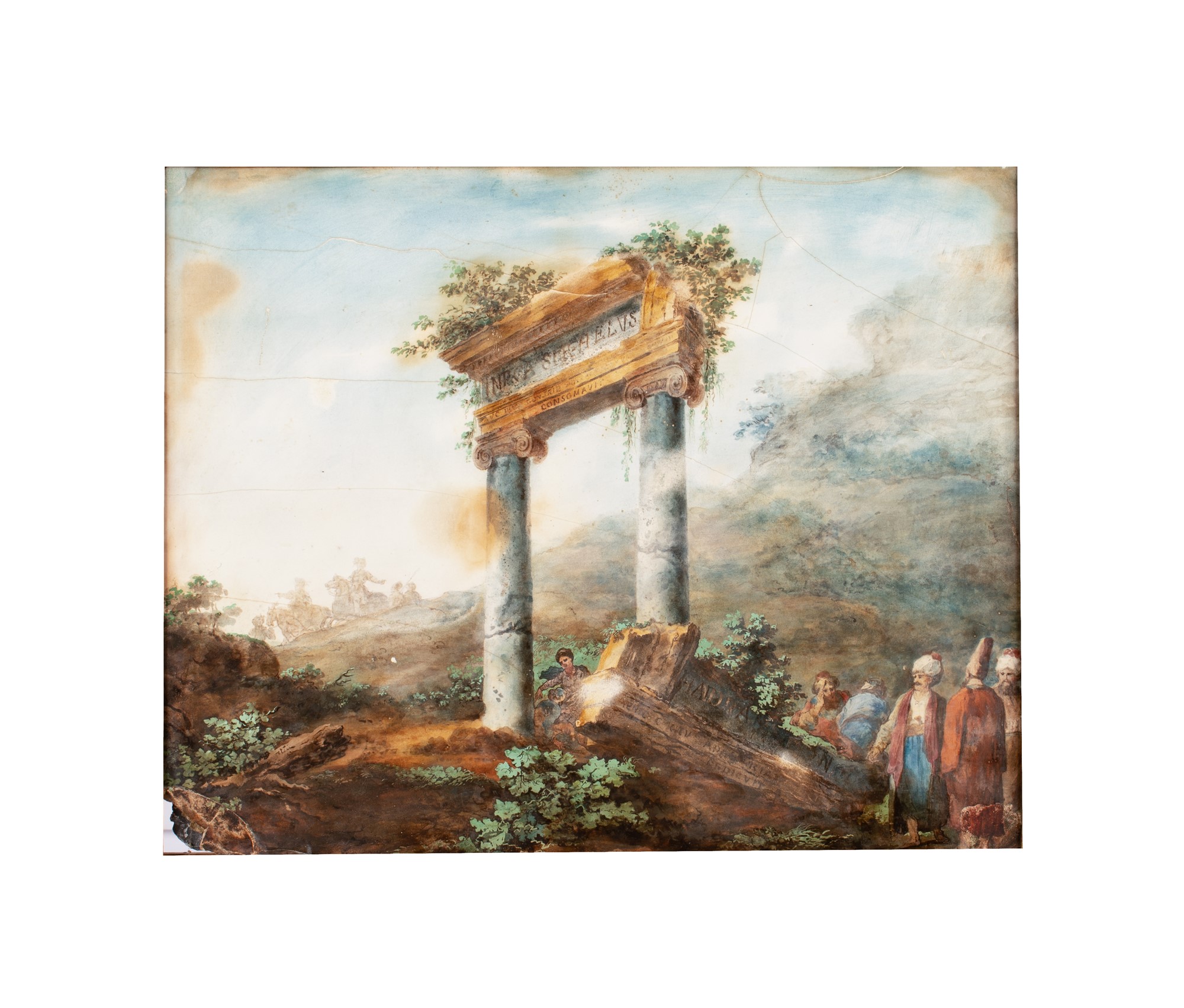 Paesaggio agreste con rovine classiche e personaggi in abiti turchi. Sullo sfondo cavalieri.