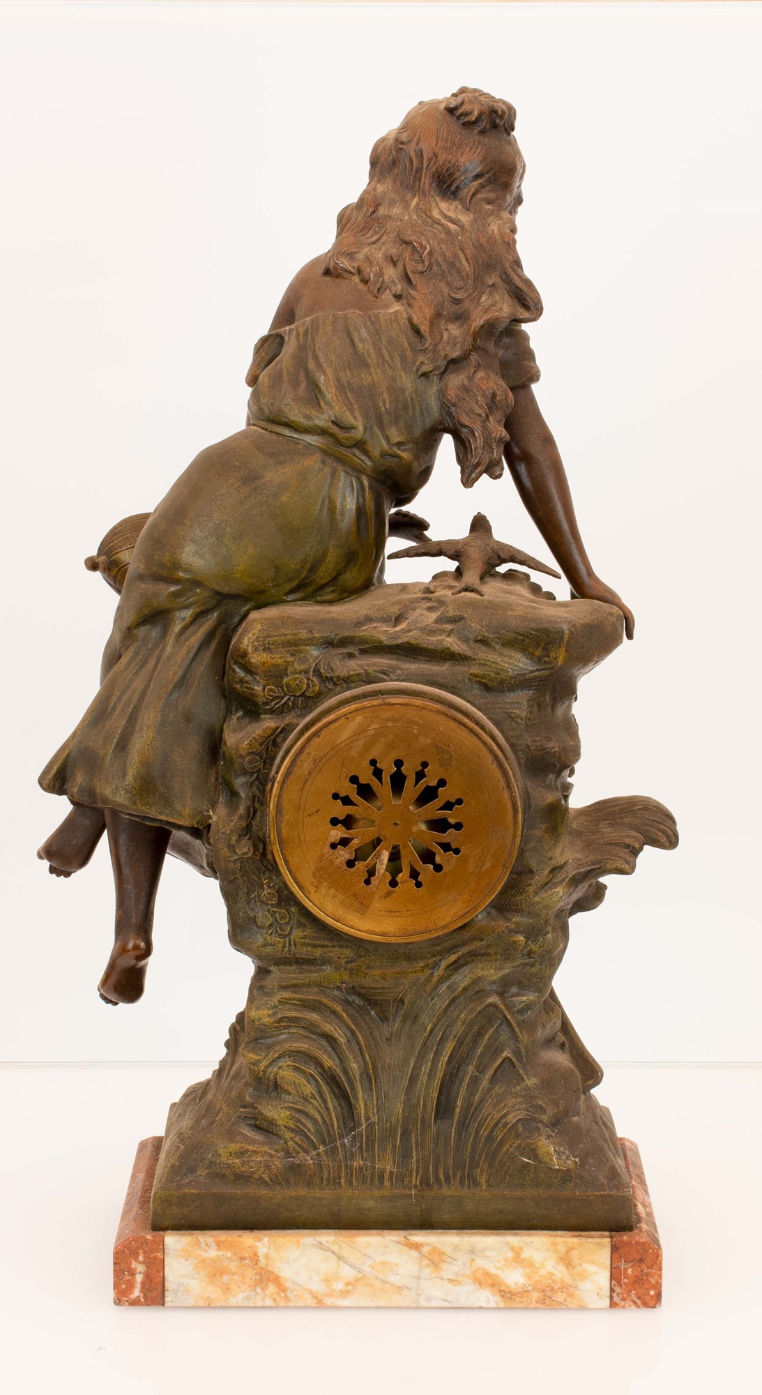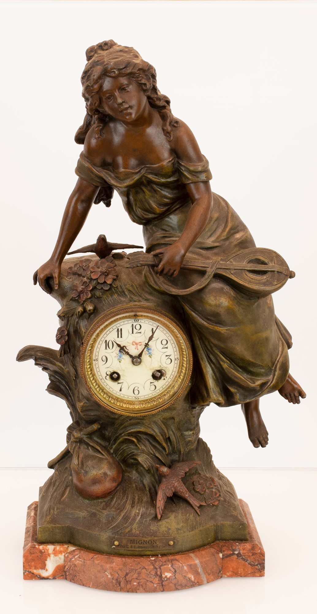 Orologio francese in bronzo da tavolo e marmo rosso rappresentante allegoria della musica Manifattura L & F Moreau