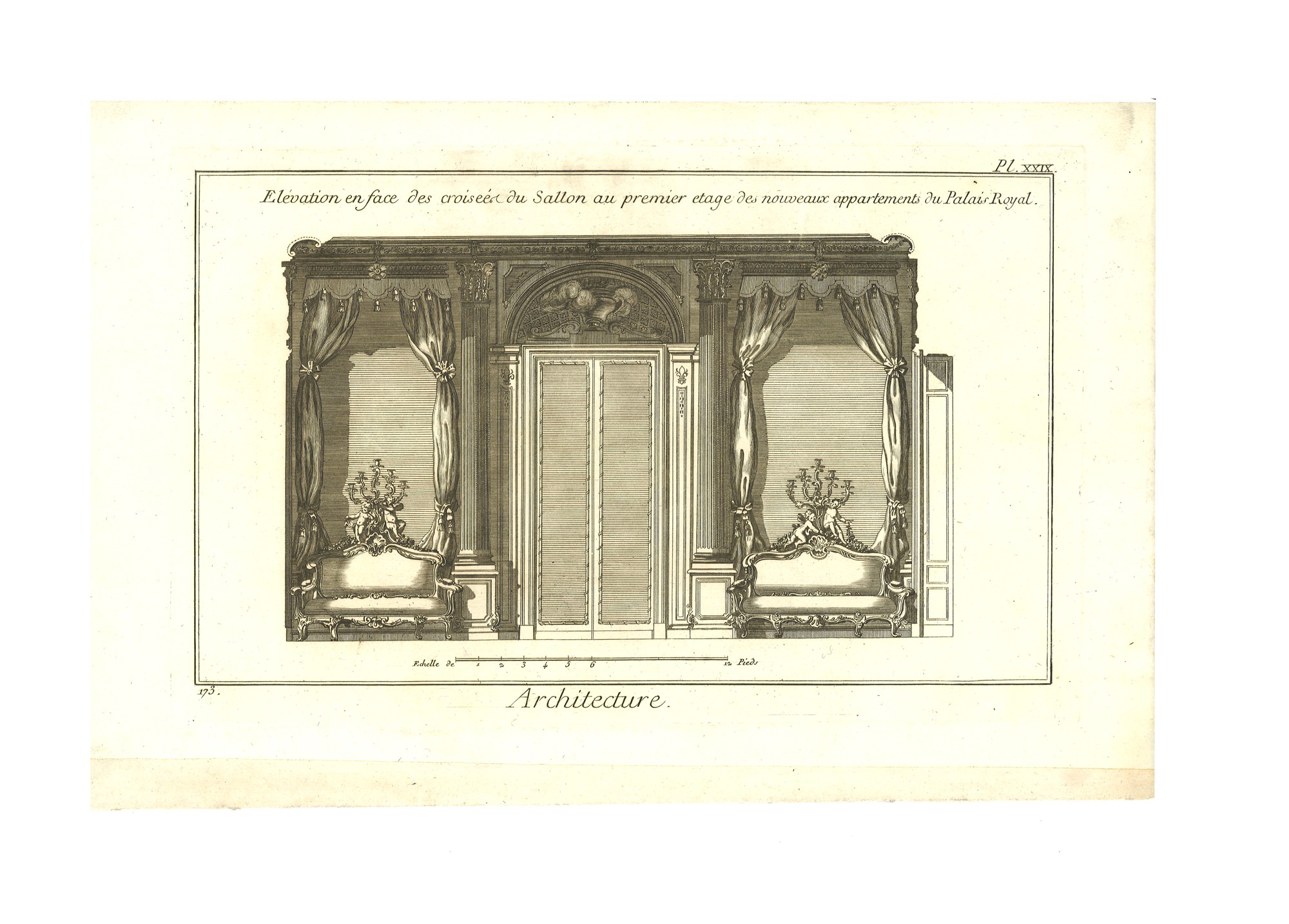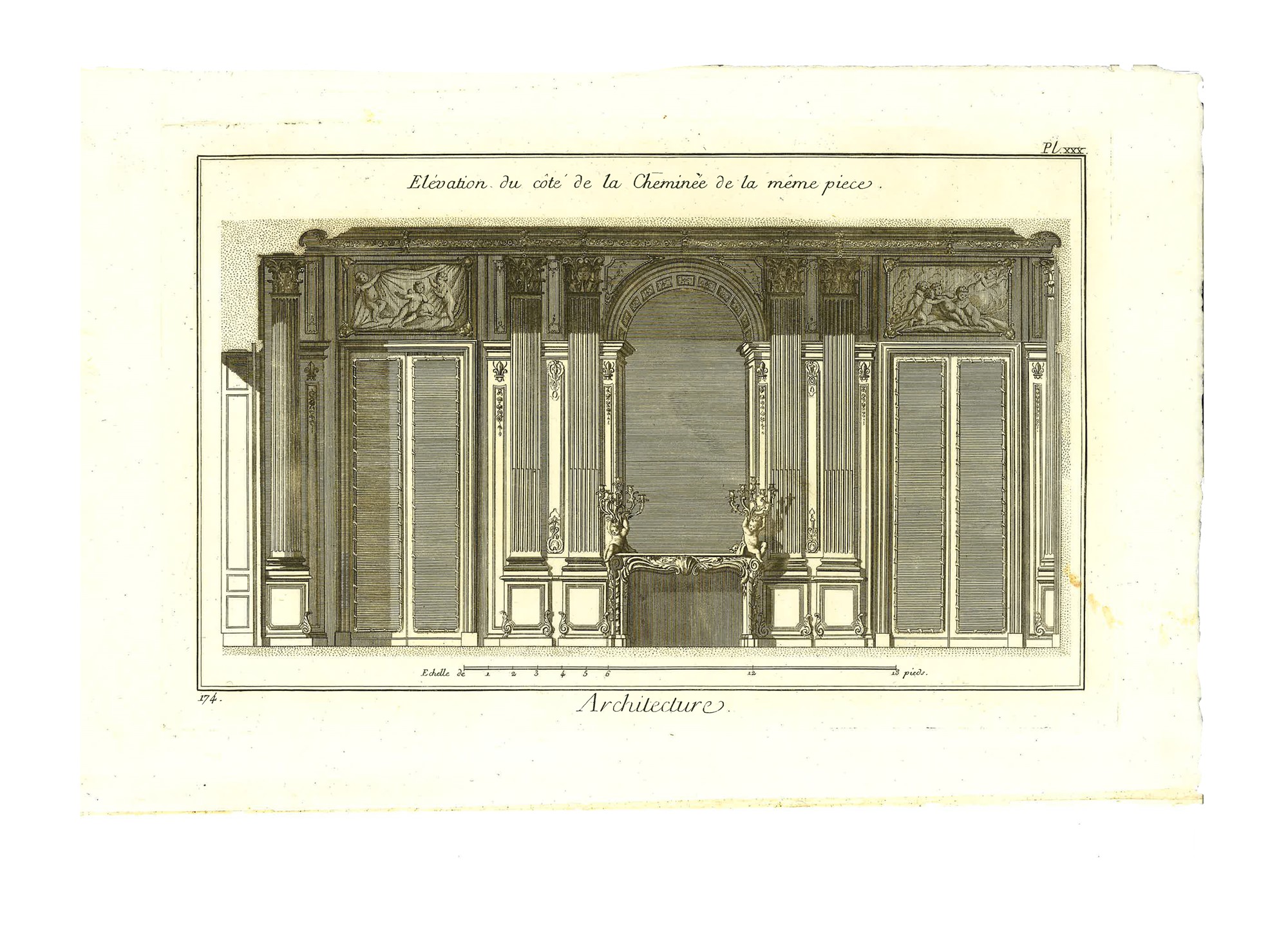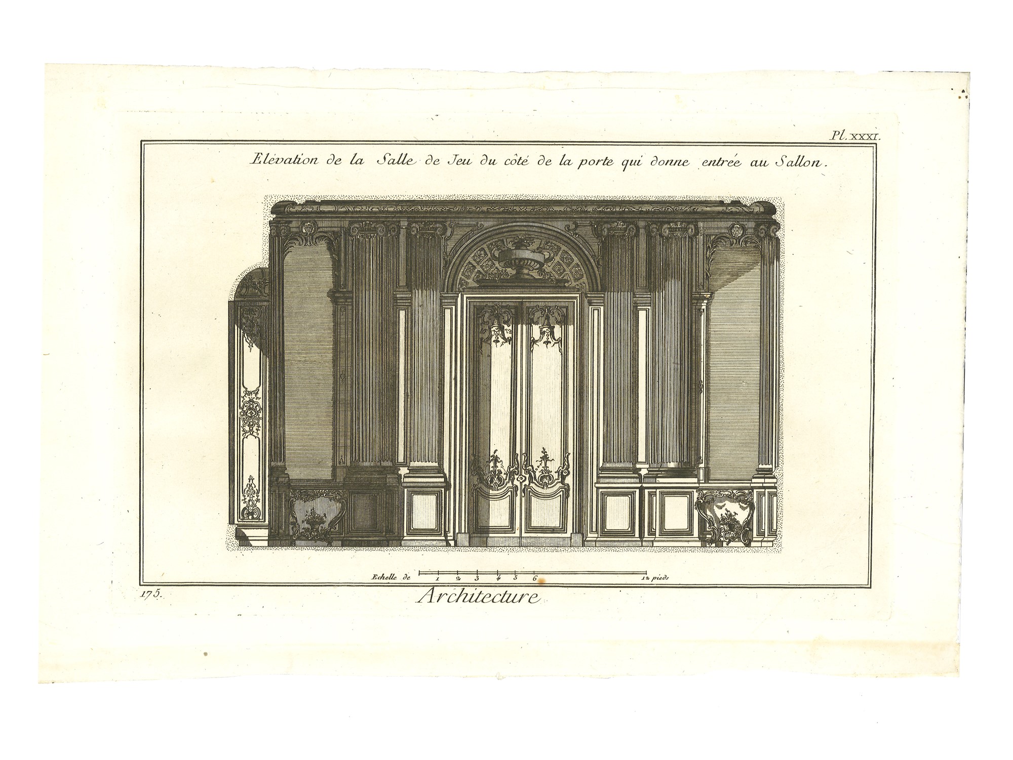 Lotto di tre incisioni dal titolo "Architecture" tratte dall'edizione ginevrina dell' "Encyclopédie, ou Dictionnaire Raisonnè des sciences, des arts, et d métiers, par una societés de glens de lettres" di Diderot e D'Alambert
