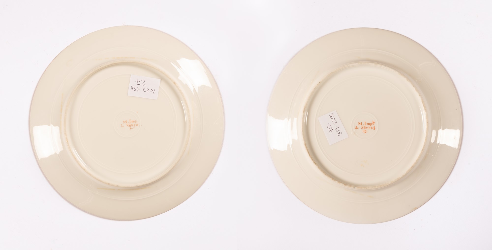Lotto 399 | Coppia di piatti in porcellana con decori in oro di gusto secondo ottocento sulla tesa e con al cavetto dipinte scene di caccia. Sevres, fine del XIX inizi - del XX secolo
