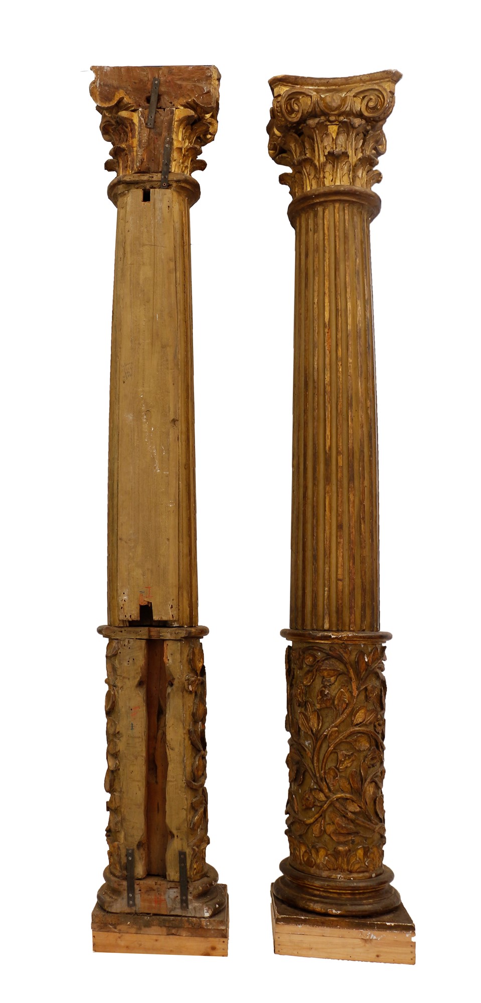Riccamente intagliate alla base con racemi. Capitelli corinzi intagliati con volute vegetali a foglie d'acanto.