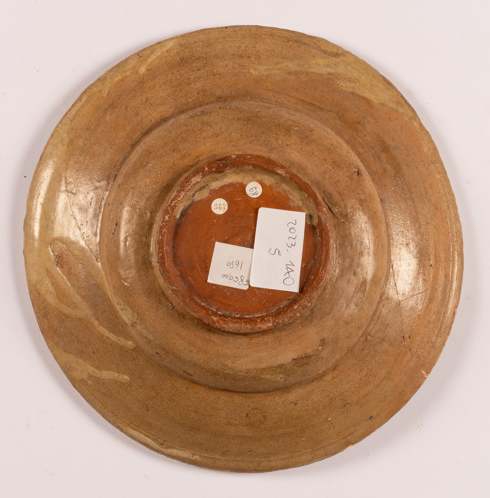Ø cm 28 alla tesa in giallo con quattro fiori blu stilizzati ai punti cardinali; cavetto decorato a motivo araldico con aste che si incrociano terminanti con decoro stilizzato a giglio.