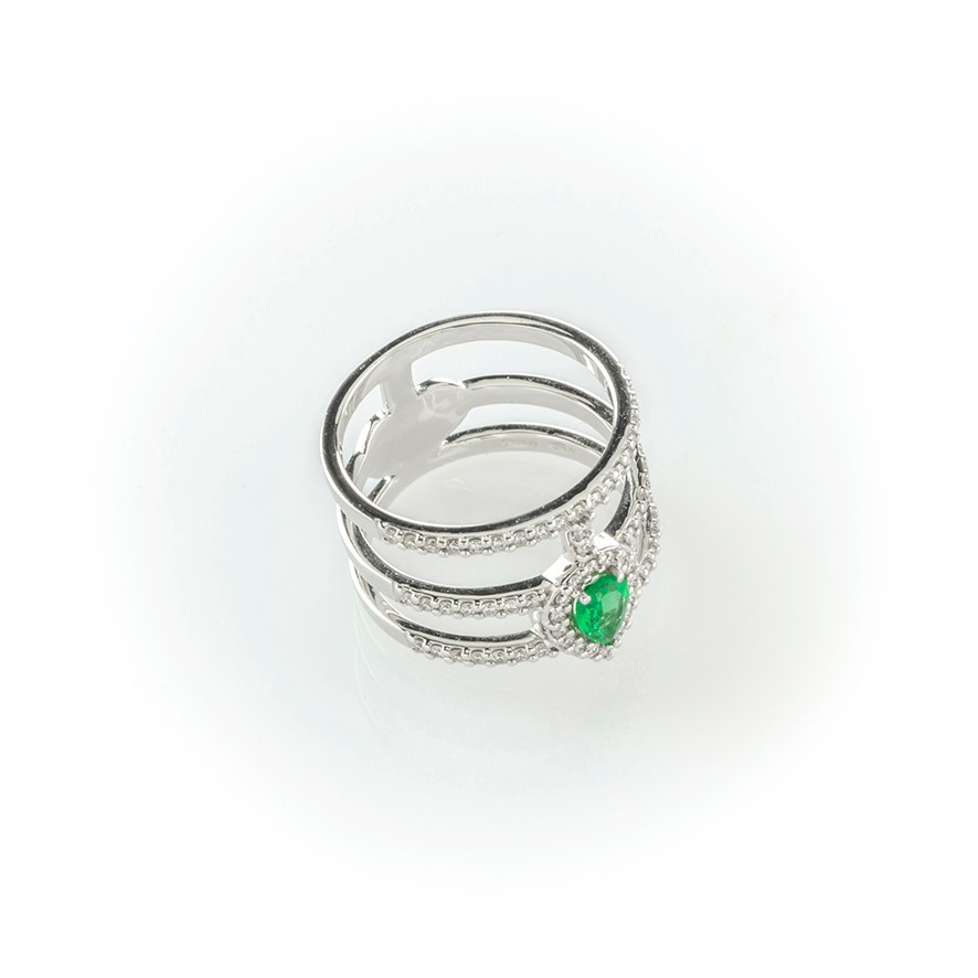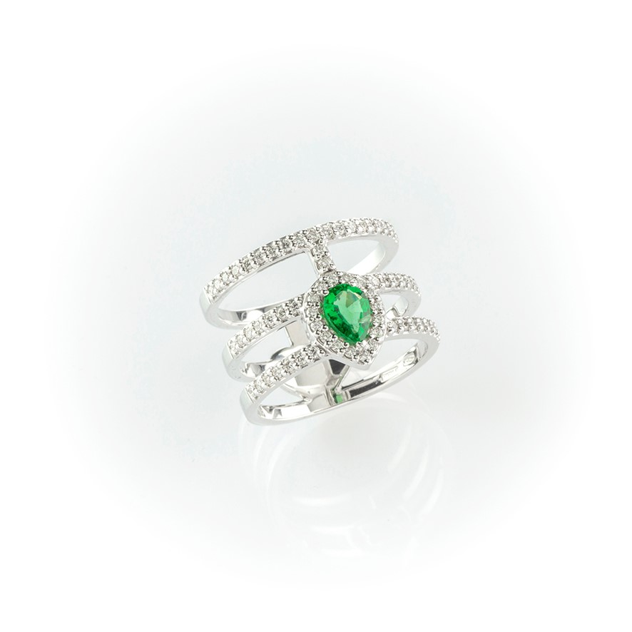 Anello a fascia in oro bianco con diamanti bianchi e smeraldo centrale taglio a goccia