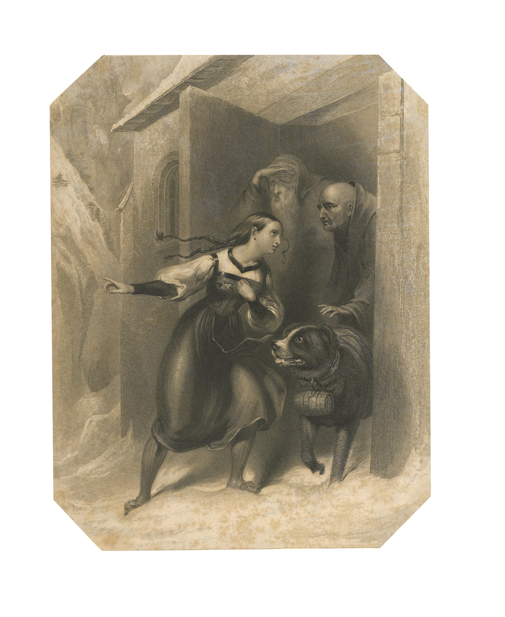 Incisione da W. Holl rappresentante una donna che bussa al convento di San Bernardo indicando che vi è una persona in difficoltà. Frank Stone