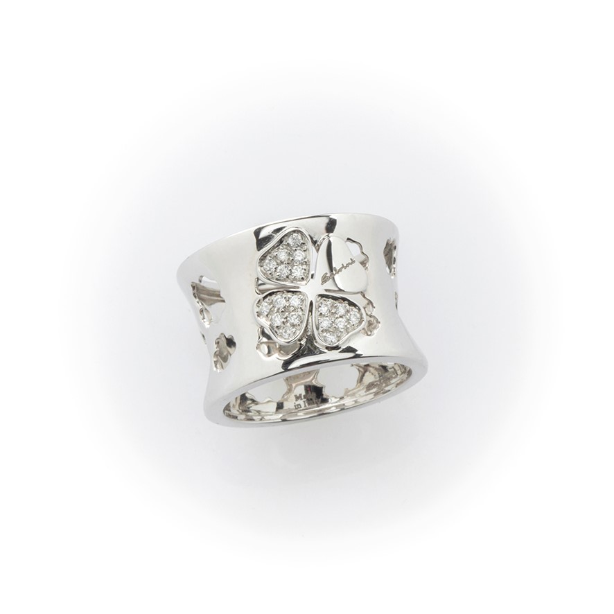 Anello a fascia in oro bianco Salvini con particolare decorazione a quadrifoglio impreziosita da diamanti taglio brillante