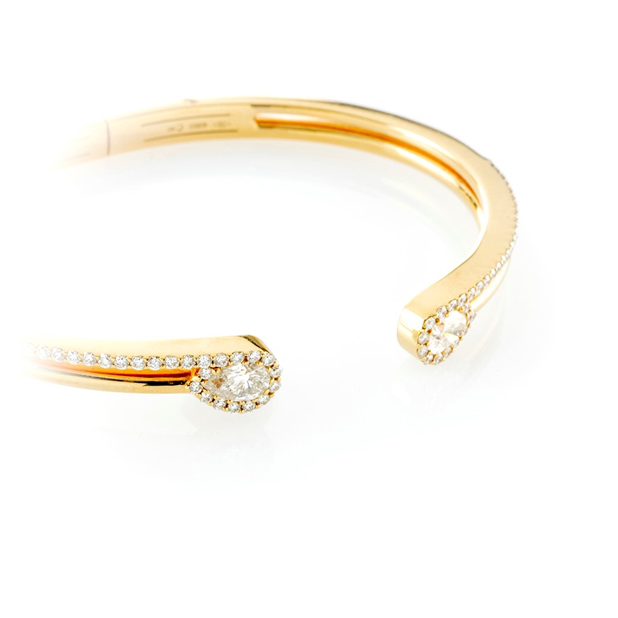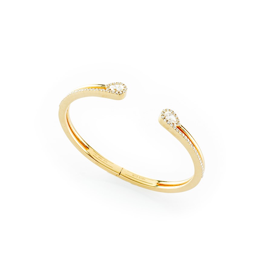 Bracciale rigido in oro giallo impreziosito da diamanti con taglio a brillante e a goccia