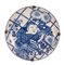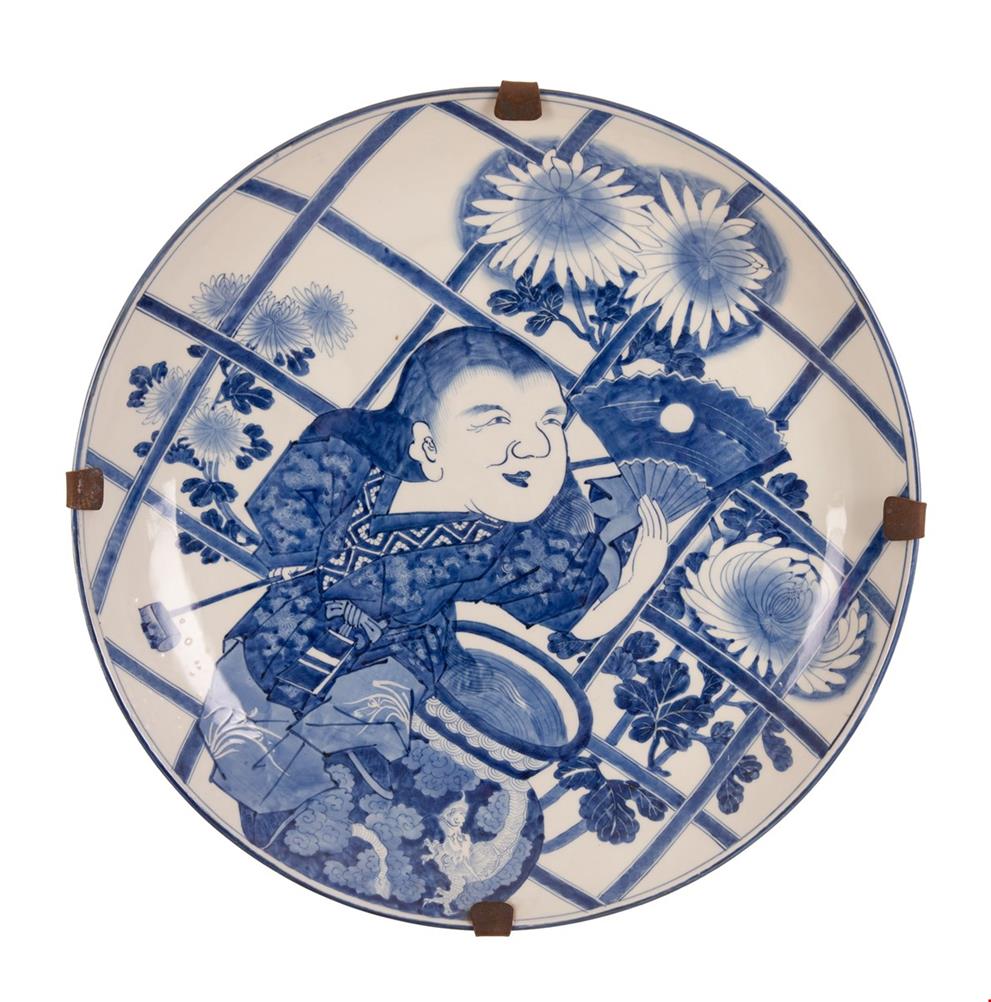 Grande piatto da parata in maiolica giapponese bianca e blu decorato al centro con figura di bambino