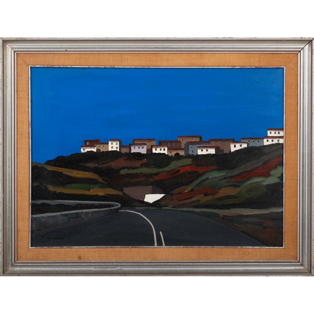 F. ROMANO, Paese dalla strada, Olio su tela
