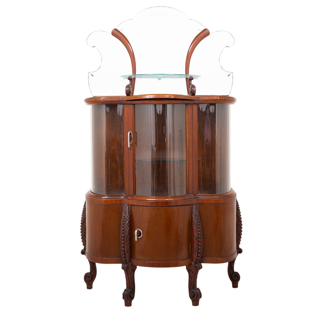 Vetrina di forma sagomata in legno di mogano con parte sottostante chiusa e parte superiore ad un'anta a giorno, periodo Decò.