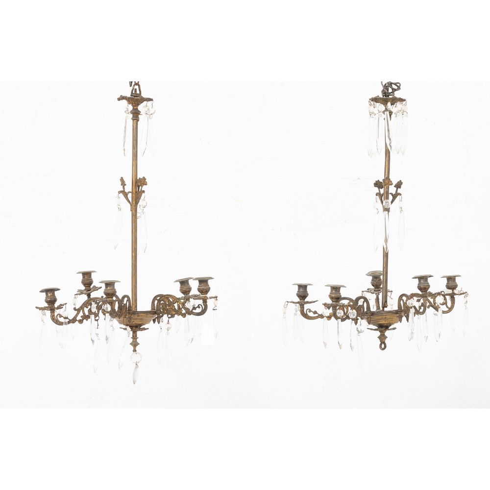Coppia di lampadari in metallo a cinque luci (elettrificato).