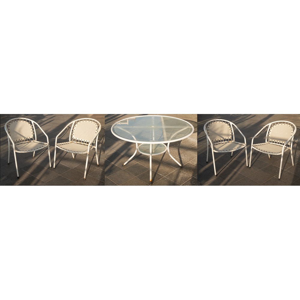 TAVOLO e quattro poltrone in ferro laccato nei toni del bianco.