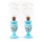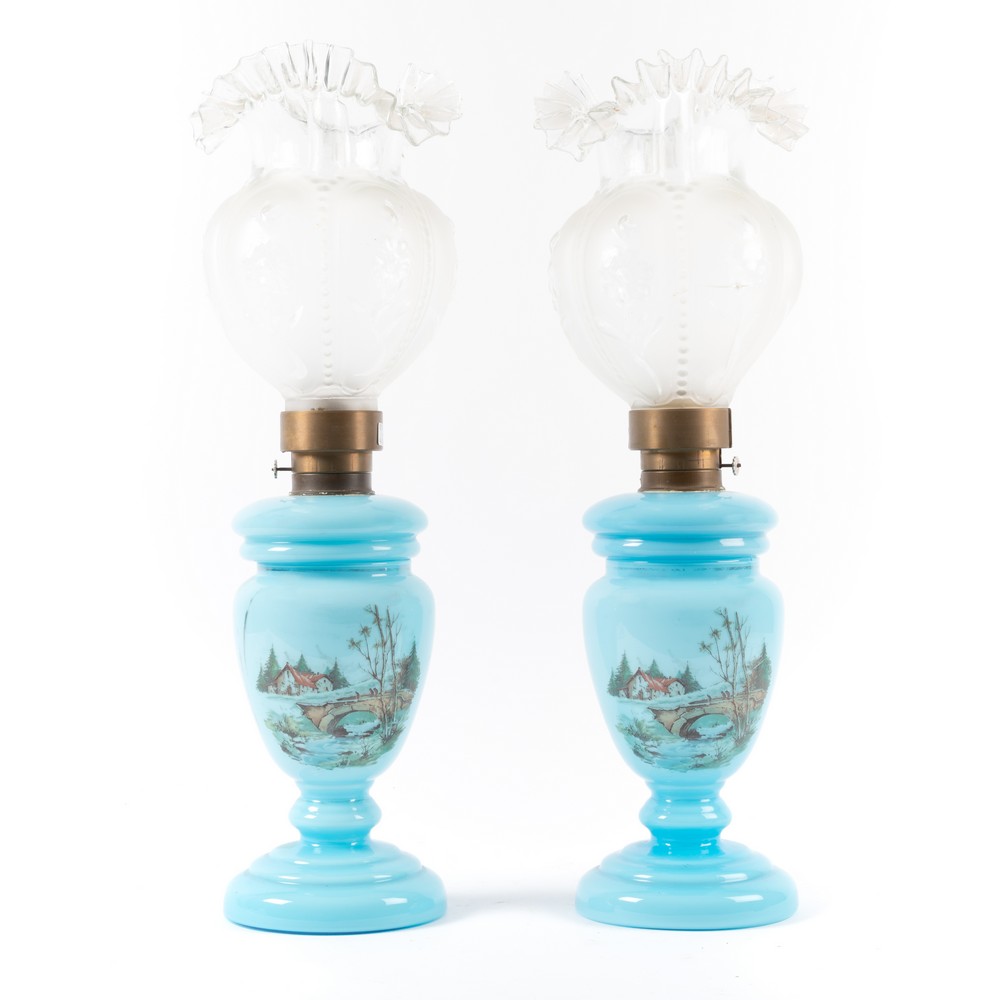 COPPIA DI LUMI a petrolio in vetro opaline decorati nei toni dell'azzurro raffiguranti "Paesaggi" con bocce e tubi in vetro.