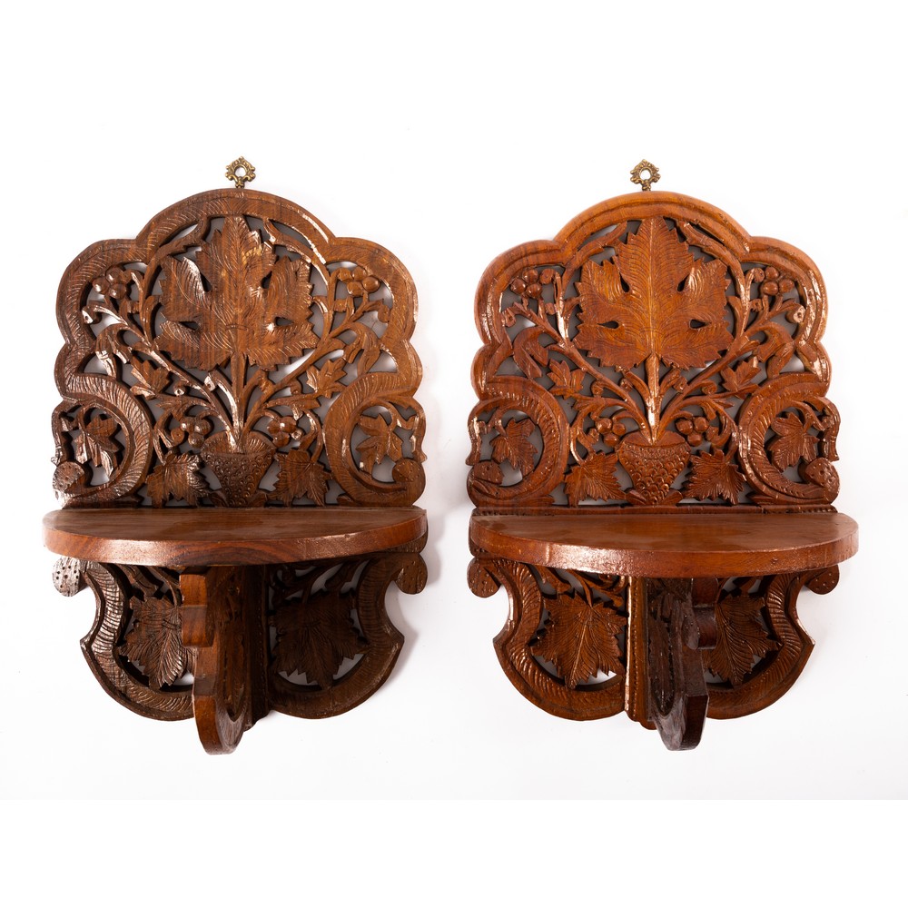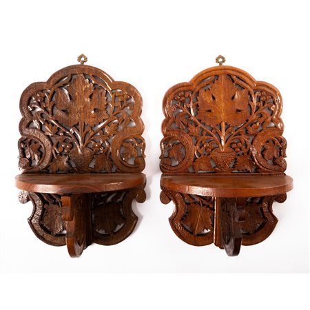 COPPIA DI PICCOLE MENSOLE in legno di rovere traforate.