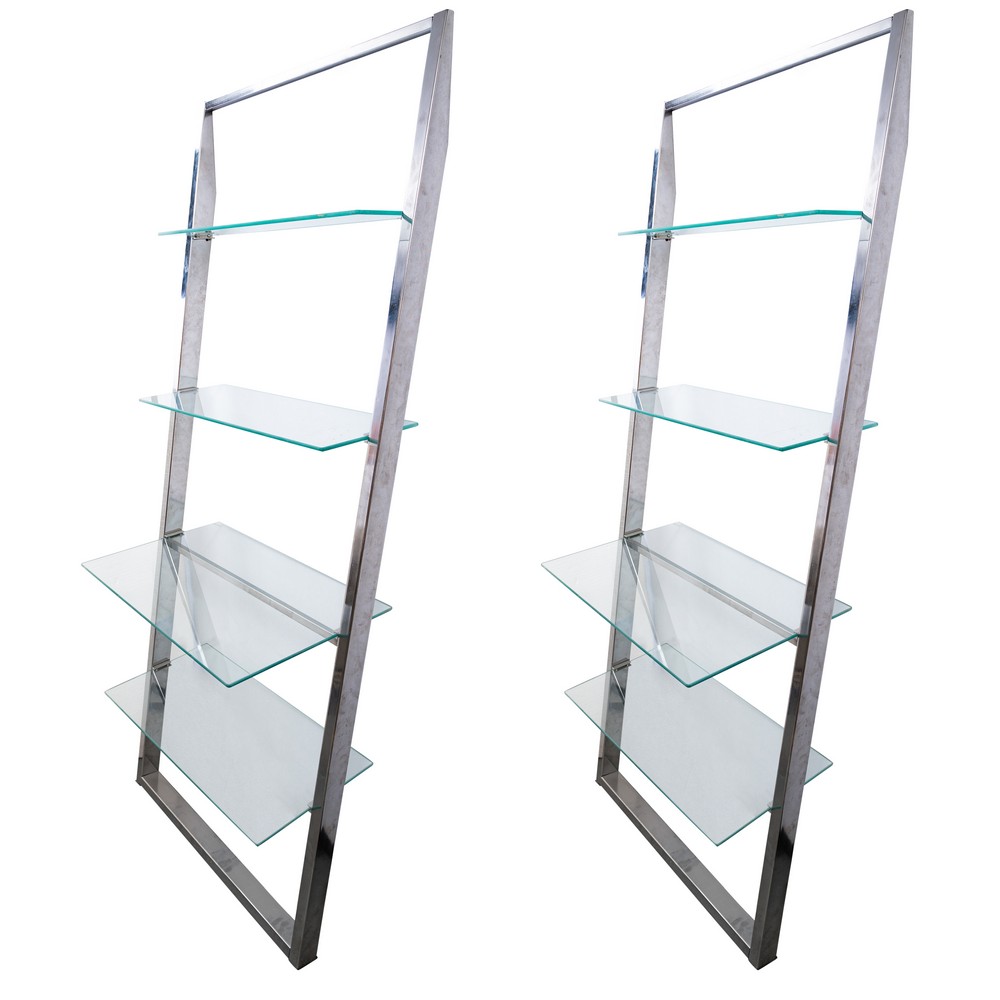 DUE LIBRERIE industriali in acciaio da muro e scaffali in vetro.