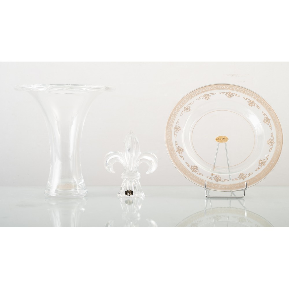 Piatto in vetro di murano lumeggiato in oro, giglio in cristallo Saint Louis e vaso in cristallo.