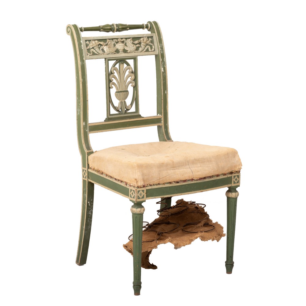 Sedia stile Impero in legno laccato nei toni del verde (seduta da sistemare).