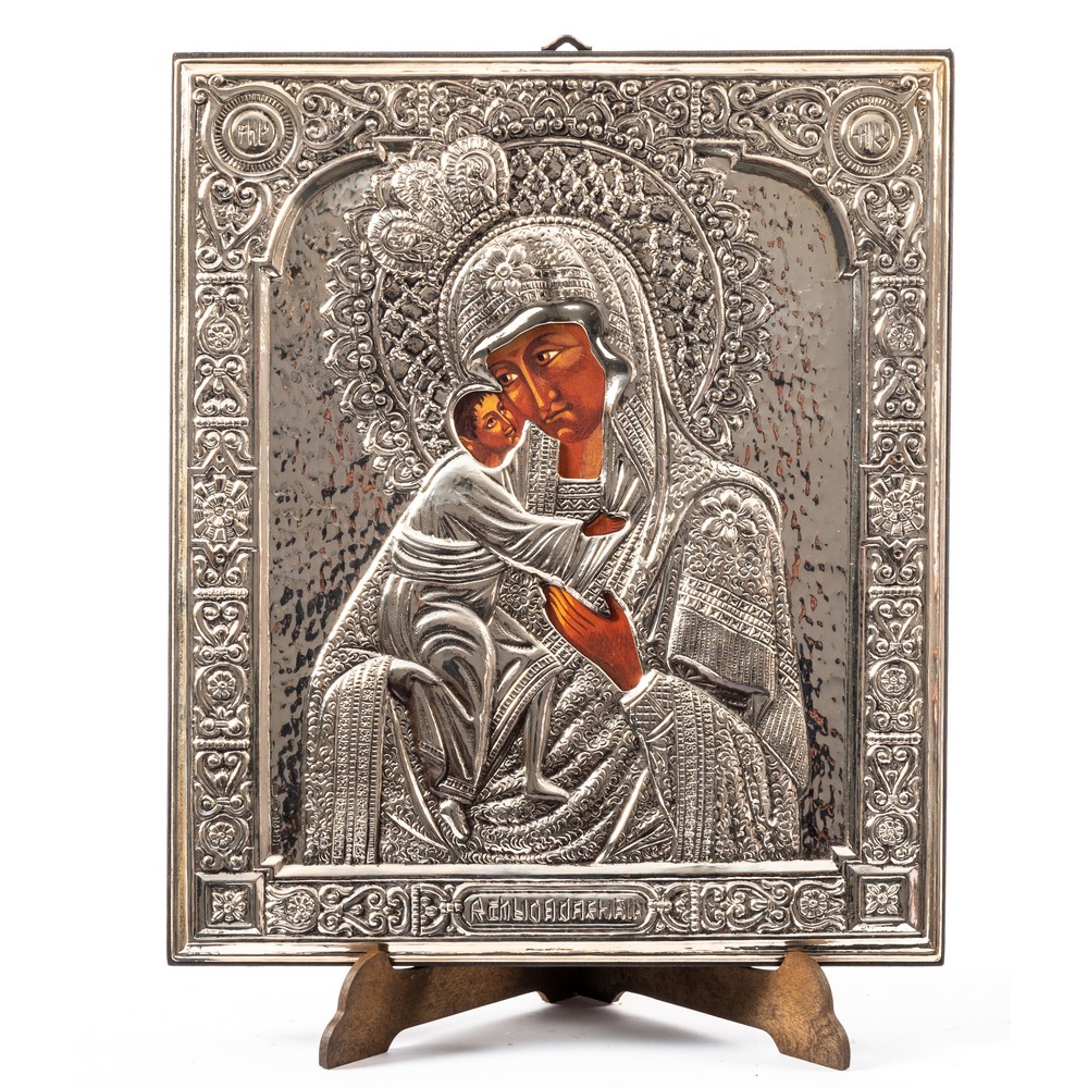 ICONA in legno con riza in metallo argentato raffigurante "Madonna con Bambino".