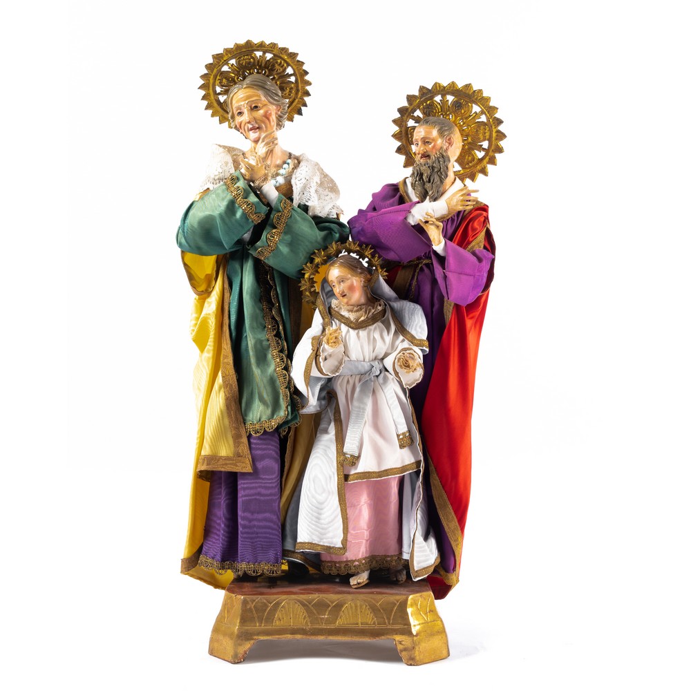 Composizione in terracotta policroma raffigurante "Sant'Anna, San Gioacchino e Maria bambina" con base in legno dorato ad oro zecchino.