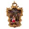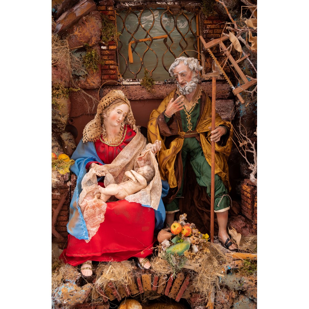 PRESEPE in terracotta dipinta raffigurante "San Giuseppe, Madonna e Bambinello" entro teca a muro con cornice dorata.