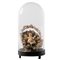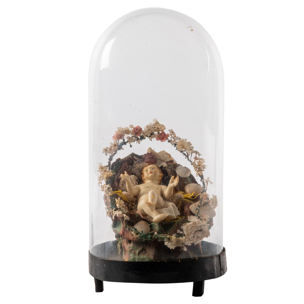 Bambinello in ceroplastica con composizione di fiorellini in seta entro campana in vetro.