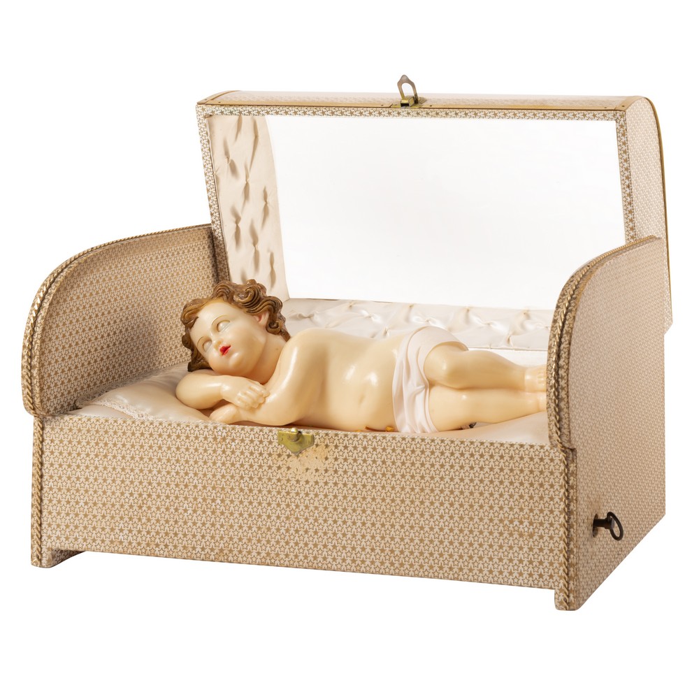 SCULTURA in ceroplastica raffigurante "Bambinello dormiente" entro teca con carillon da revisionare.