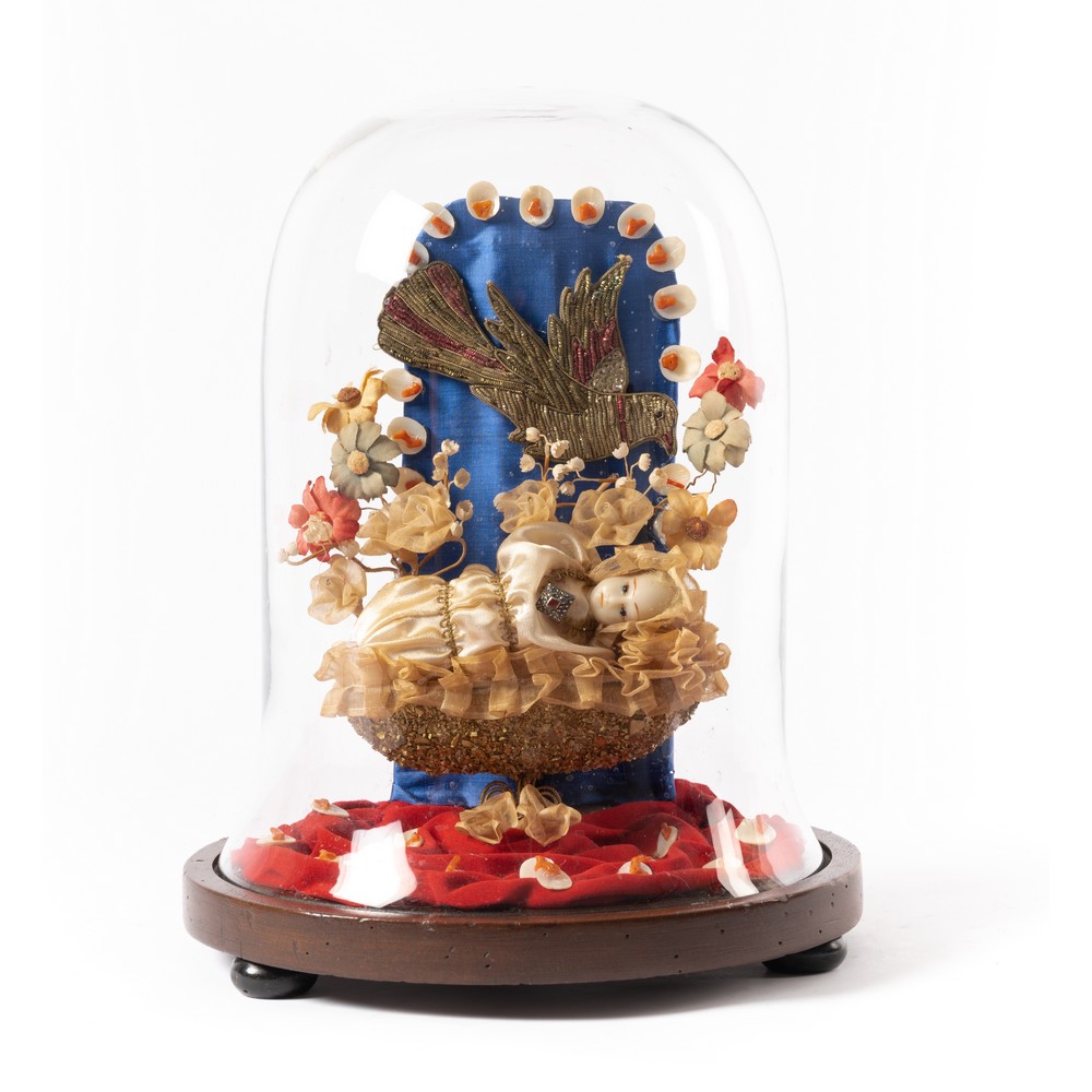 Madonna bambina in ceroplastica con composizione in madreperla, corallo e fiori in seta entro campana di vetro e base in legno.