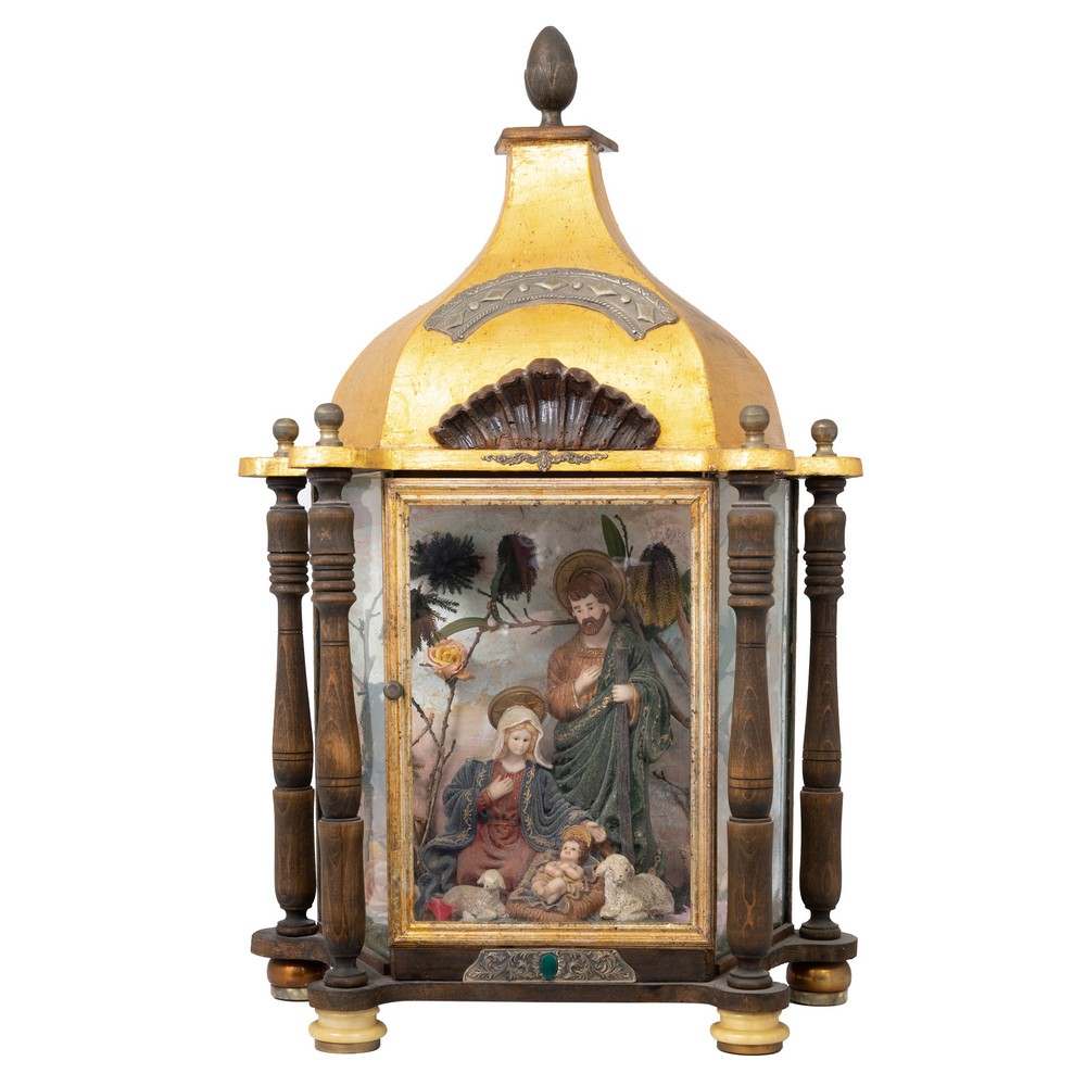 PRESEPE entro teca in legno laccato e dipinto con personaggi ed applicazioni di fiori in seta.