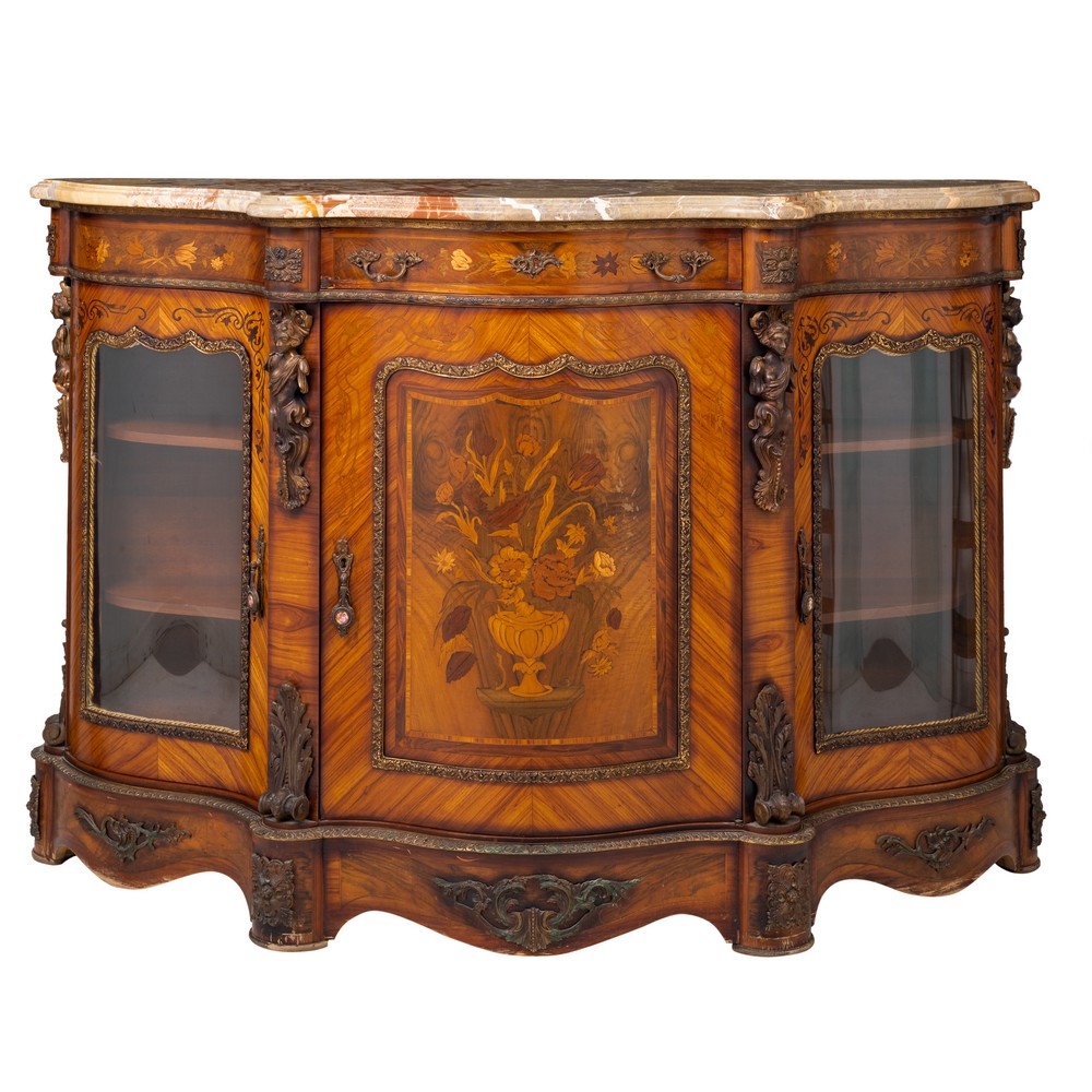 Servante a tre ante di cui due a vetro in legno di noce e bois de rose, tarsie in bosso e palissandro, guarniture in bronzo e placche in porcellana con piano in marmo venato.
