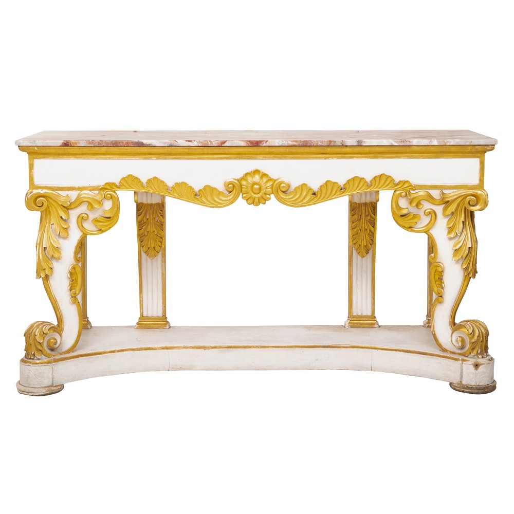 Imponente consolle in legno laccato e dorato a oro zecchino, con piano in marmo venato.