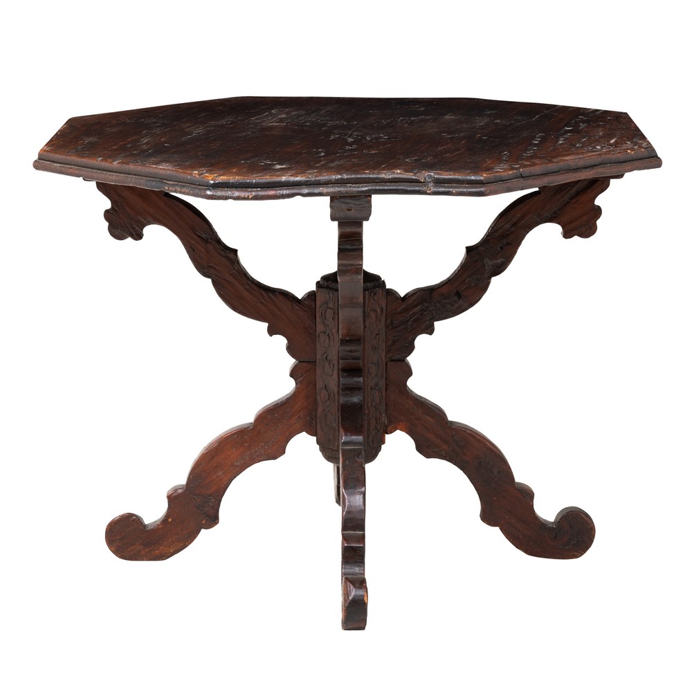 TAVOLO di gusto seicentesco in legno di castagno di forma ottagonale.