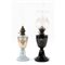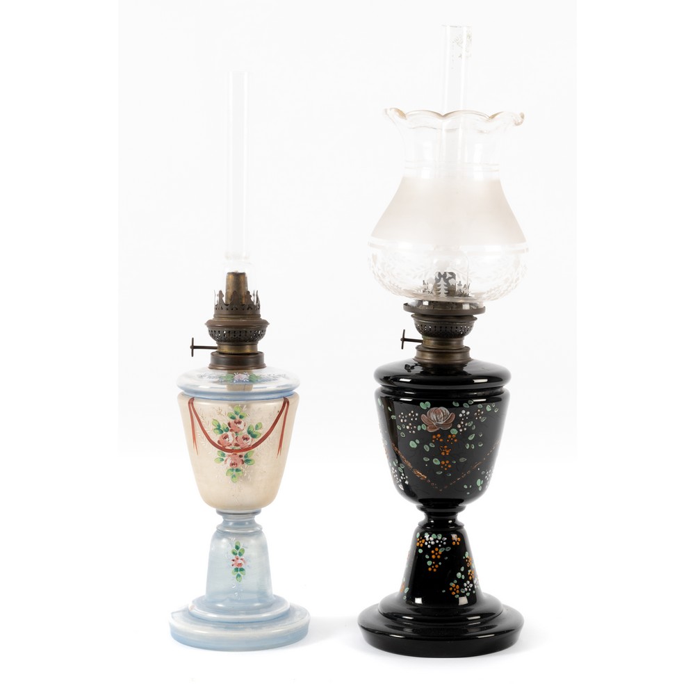 Lume in vetro opaline nei toni del nero con decori dipinti raffigurante "Fiori", con boccia e tubo e lume in vetro decorato e dipinto.