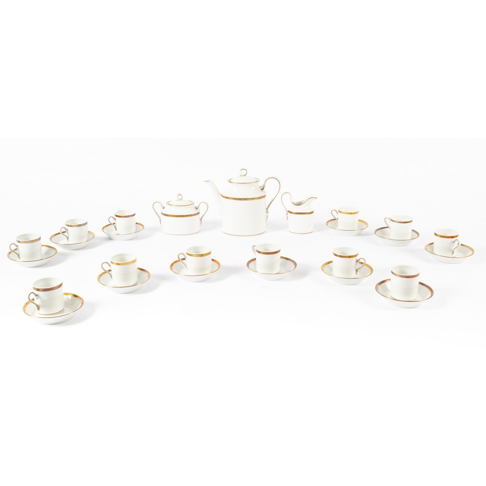 Servizio da caffè in porcellana bianca composto da: caffettiera, lattiera, zuccheriera e 12 tazzine con piattini, lumeggiture in oro.