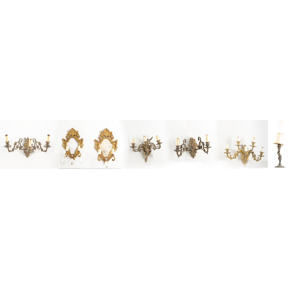 Quattro applique a tre fiamme in ottone, due applique con cornice in metallo dorato e piccolo lume in ottone.