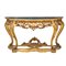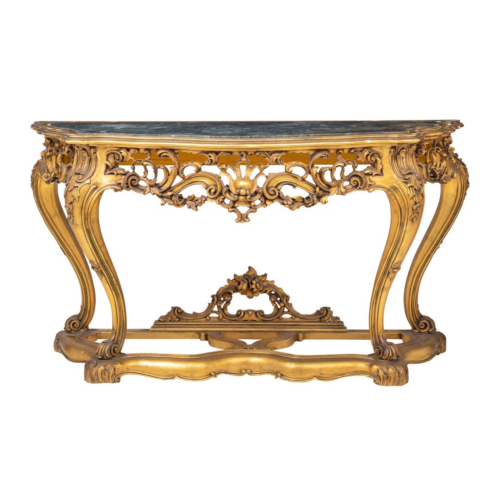 CONSOLLE sagomata di gusto barocco in legno dorato con piano in marmo verde venato.
