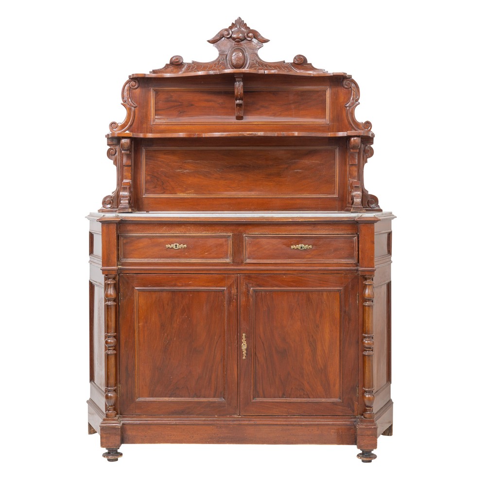 Piattaia scantonata in legno di noce a due porte e due cassetti con alzata a due ripiani, piano in marmo grigio incassato.