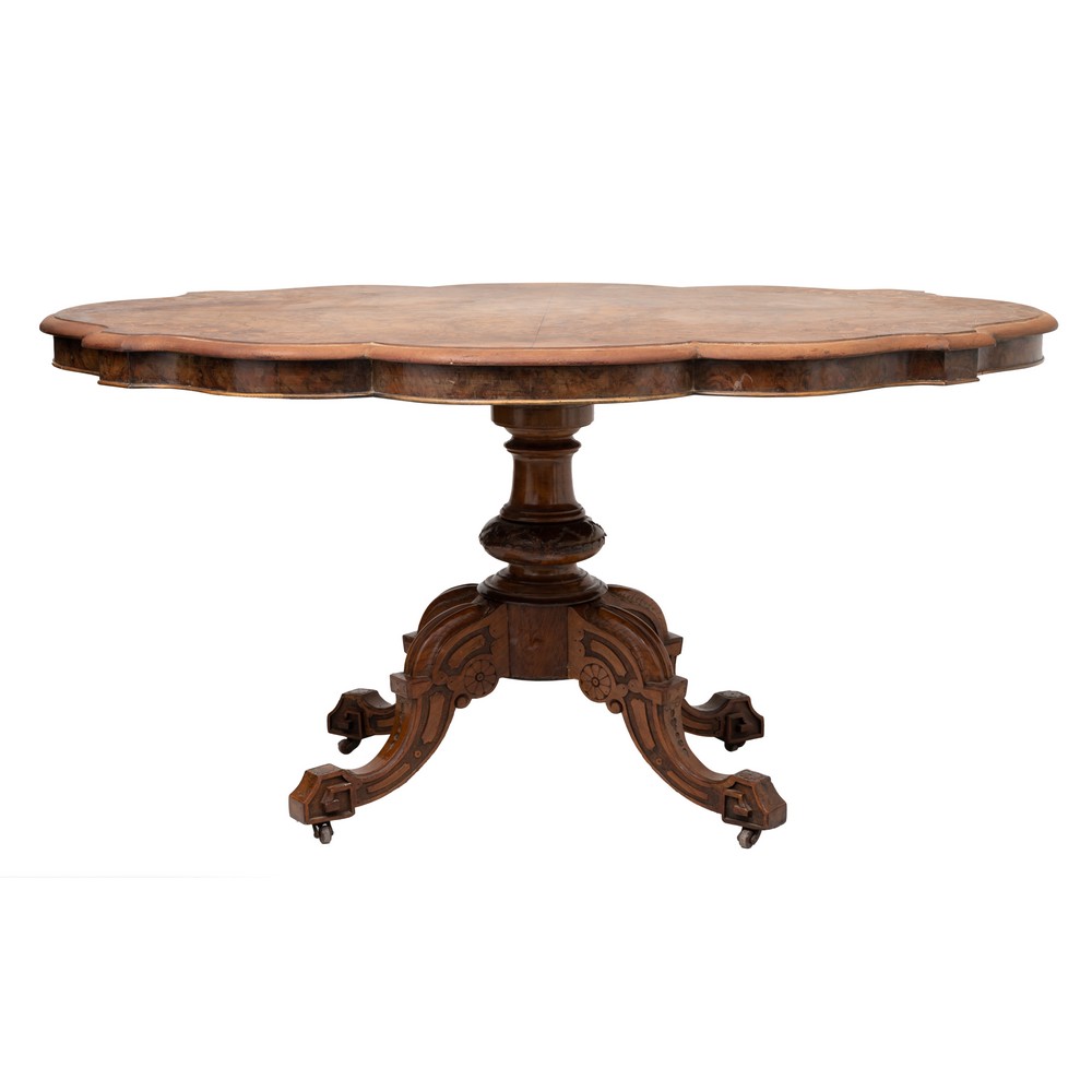 Tavolo di forma sagomato in noce e radica di noce con tarsie in bosso.