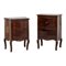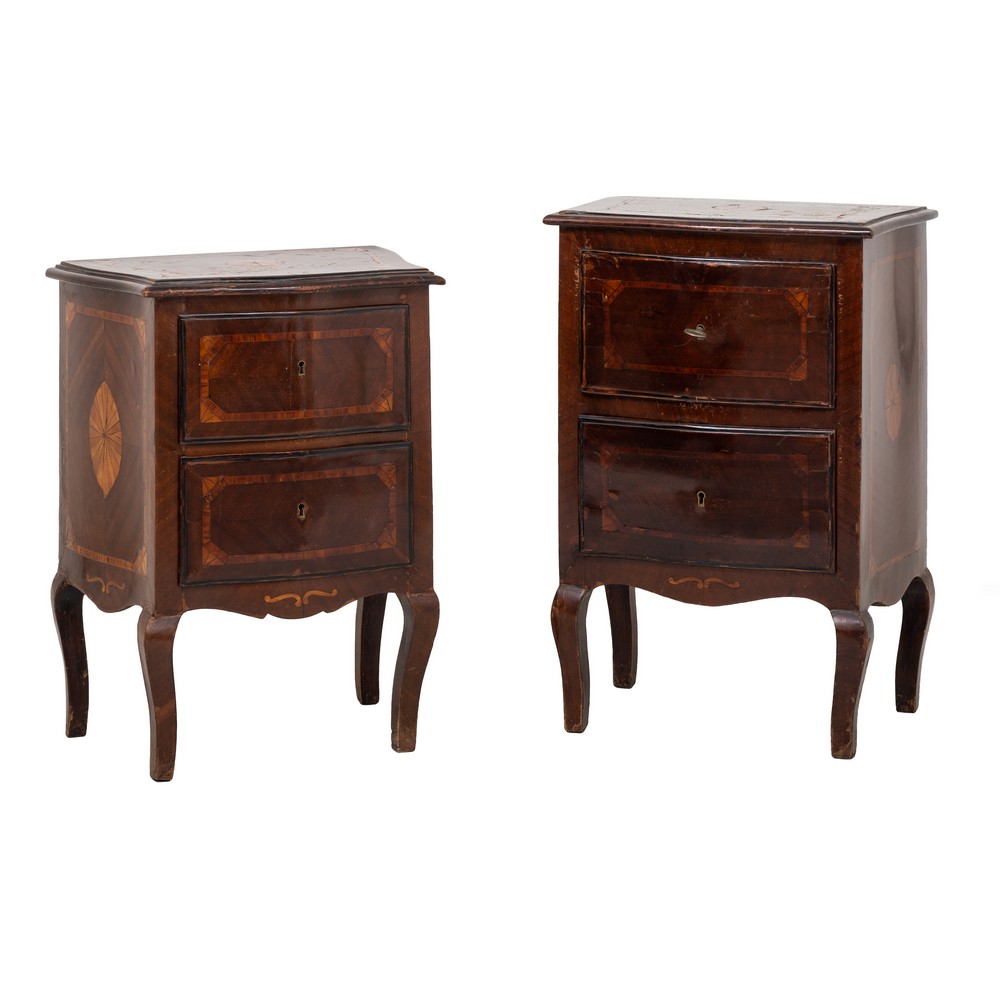 Coppia di comodini a due cassetti con tarsie e marchetteria in legno bois de rose.
